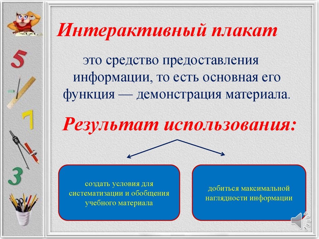 Плакат — наглядное изображение, которое может быть использовано для рекламы, агитации, обучения и т.п. Независимо от целей использования плакат — это средство предоставления информации, то есть основная его функция — демонстрация материала. Понятие интерактивности означает способность информационно-коммуникационной системы реагировать на действия пользователя. То есть к разряду интерактивных плакатов мы можем отнести средства предоставления информации с различными вариантами реакций на действия пользователя. Из этого следует, что интерактивным плакатом нельзя считать статичную иллюстрацию или один только набор мультимедийных компонентов. Только систему, в которой контент взаимодействует с пользователем посредством ссылок, областей текстового/цифрового входа, кнопок перехода и других интерактивных элементов. Интерактивные плакаты применяются, главным образом, в сфере образования, и здесь они решают две важные задачи: Мой интерактивный плакат: