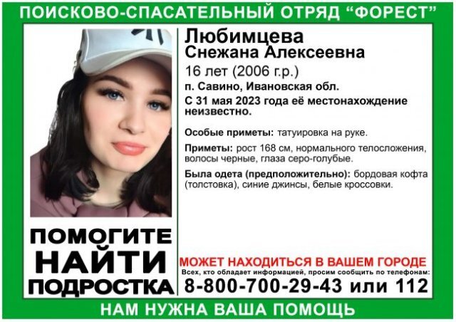 В Ивановской области разыскивают 16-летнюю Снежану Любимцеву, сообщает поисково-спасательный отряд «Форест». О судьбе девушки ничего неизвестно с 31 мая. Снежана исчезла в посёлке Савино. Рост пропавшей – 168 см, среднего телосложения, волосы чёрного цвета, глаза - серо-голубого. Была одета в бордовую кофту, синие джинсы и белые кроссовки. Из особых примет – татуировка на руке. Сообщить информацию о местонахождении девушки можно по телефонам 8-910-999-31-19; 8-800-700-29-43 или 112.