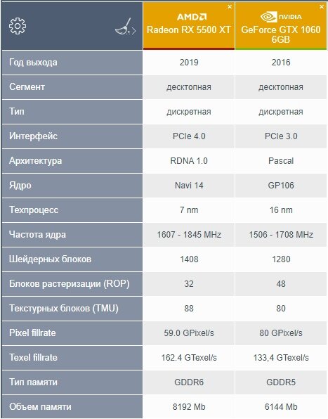 Всем привет! Уже поднадоело разбирать хлам. Хочу немного поговорить о видеокартах в дешевом ценовом сегменте. Что могут на данный момент и могут ли вообще? Захотел взять для сравнения популярные решения от Nvidia и AMD. Поговорим о RX 5500 XT и GTX 1060 версией на 6гб. У китайских друзей с Али экспресс данные карты стоят примерно одинаково, если быть точнее, то около 8000 рублей. На авито теже карты стоят от 7000 рублей. Ценник примерно одинаковый. Перед Вами кратенькое сравнение. Видим что основные отличия конечно в годе выпуска и типе памяти. Техпроцесс тоже сильно разнится. В играх же, отличия практически отсутствуют. Как говорится кому что нравится. Очевидного ответа нет. Но я бы брал конечно красных. Меньше вероятности того, что карта отмайнена в край.