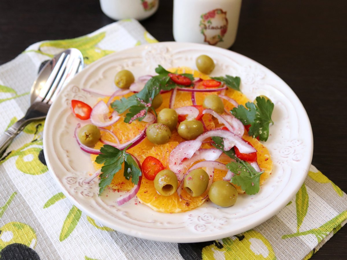 Этот салат из апельсинов и оливок не только красивый и яркий, но и невероятно аппетитный и вкусный. Такой салат на родине называют Мункачина. Хотите чего-то необычного и сочного, тогда смело готовьте этот солнечный салат! Для салата отлично подходит малиновая соль. Ингредиенты Приготовление: 1. Подготовить ингредиенты для салата. Апельсин и овощи хорошо помыть. Оливки отцедить от маринада. 2. У апельсина острым ножом срезать шкурку вместе с белой пленкой. Нарезать тонкими колечками или вырезать мякоть из долек. 3. Лук нарезать тонкими перьями. Лук для салата нужен не острый, а сочный и сладкий. 4. Теперь остаётся собрать салат на тарелке. Разложить кольца апельсина, а сверху распределить лук, оливки, зелень и чили. По вкусу посолить, поперчить и сбрызнуть оливковым маслом. 5. Арабский салат из апельсинов готов!