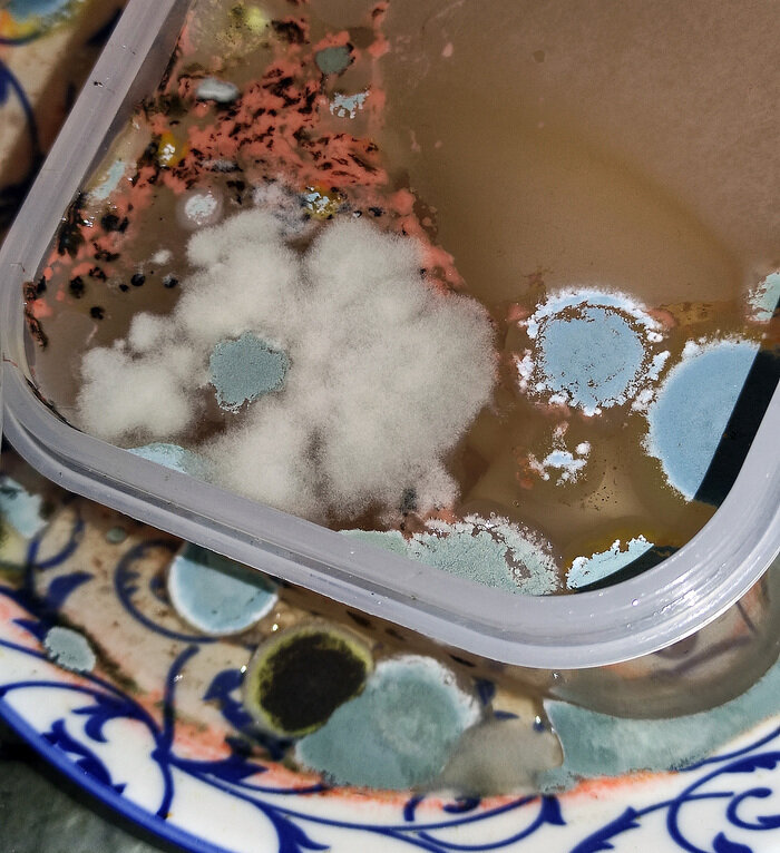 Как-то раз загорелся идеей вырастить что-нибудь у себя дома на батарее, просто из любопытства, но в итоге столкнулся с тем, что готовые стерильные чашки Петри продаются только коробками по 2000 штук, а мне столько точно не надо, ну и забыл. Оказывается, нужно просто не мыть посуду неделю и красивый и загадочный микромир сам придёт к тебе. В основном там масса бирюзовых колоний, но меня заинтересовало вот это белое пушистое облачко. Что это? Внизу тоже непонятно, то ли бирюзовая соевый соус жрёт, то ли это отдельная чёрная. Я не отношусь к таким вещам с презрением и брезгливостью, как многие, скорее с любопытством. Может существует какой-то "детский" гайд по видам плесени и других микроорганизмов с картинками для таких любопытствующих, как я? Пост автора Nereid. Узнать, что думают пикабушники.