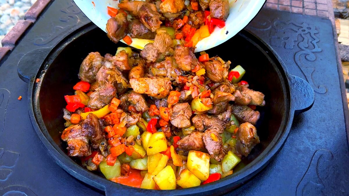 Привет дорогой подписчик и гость нашего канала! Сегодня готовим одно из вкуснейших грузинских блюд “ХОРЦИАНИ” Ингредиенты: Свинина - 1.5 кг Картошка - 1 кг Лук - 600 гр Болгарский перец - 600 гр Морковь - 600 гр Баклажаны - 700 гр Помидоры - 500 кг Протертые томаты 400 мл. Сливочное масло - 100 гр Растительное масло - 100 мл Чеснок -2 головки Аджика -150 гр. Зелень кинзы - пучок Соль - по вкусу Паприка - по вкус Хмели-сунели по вкусу Приготовление: Мясо нужно нарезать на одинаковые порционные кусочки, размером примерно по 60 гр. К мясу добавляем грузинскую или можно абхазскую аджику. Перемешиваем, так чтобы каждый кусочек был в аджике. Мариновать нужно не менее 1 часа. Можно мясо замариновать с вечера, тогда оно будет еще вкуснее. Пока маринуется мясо, крупно нарезаем все овощи: (морковь, лук, картофель, сладкий перец, баклажаны, помидоры). Перцы лучше брать разного цвета, так блюдо будет выглядеть ярче и красивее. Чеснок нарезаем на тоненькие пластинки. Далее ставим казан на огонь и в