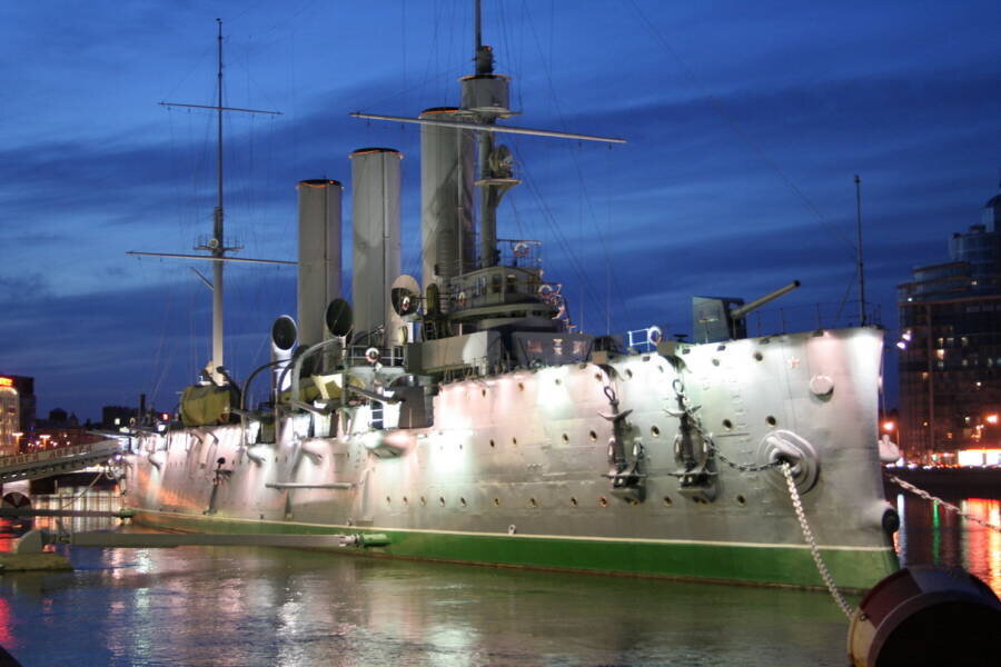 Крейсер «Аврора» спустили на воду в 1900 году и с тех пор неоднократно модернизировали. Боевым крещением для него стало Цусимское сражение, после которого он оказался в Маниле, нынешней столице Филиппин. Корабль получил повреждения, погибли 16 членов экипажа, включая капитана. Только после подписания Портсмутского мира моряки отправились домой.