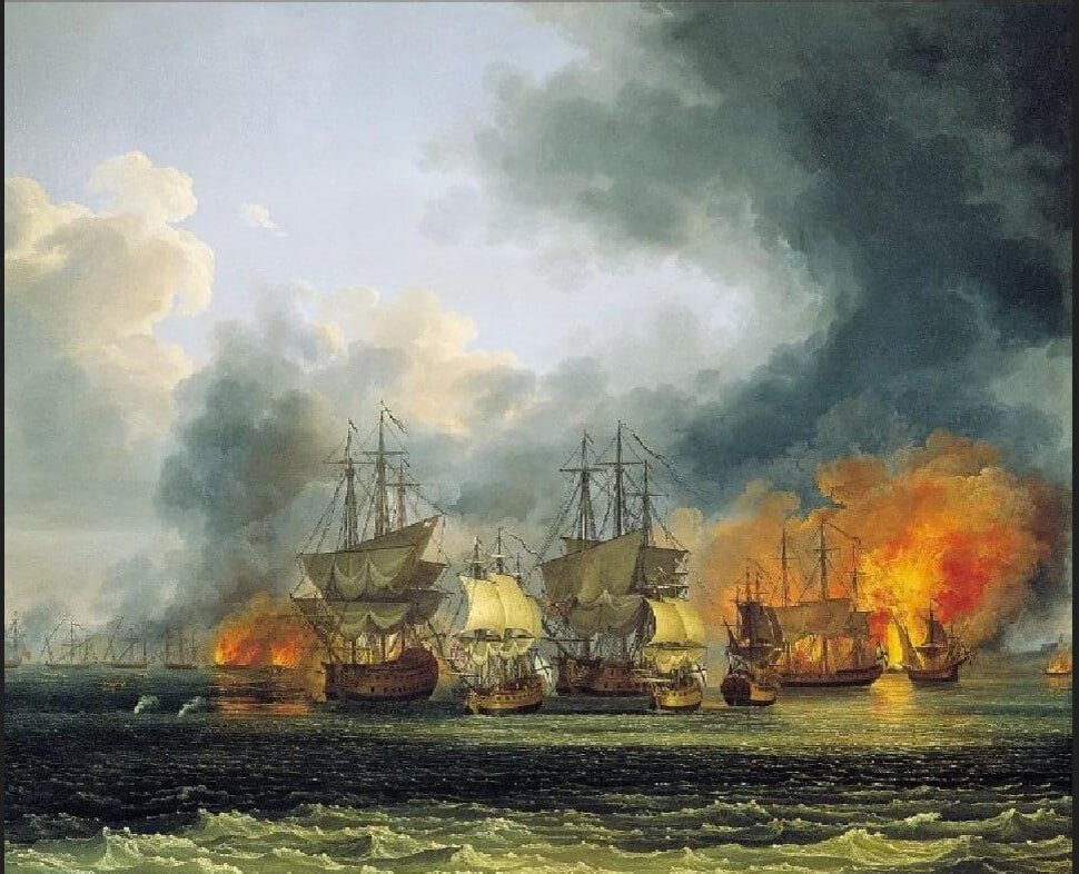 Тщательно выполненная картина «Сражение у города Патрас». 1778 год. Чесменский зал Большого Петергофского дворца. Автор Якоб Филипп Хаккерт.