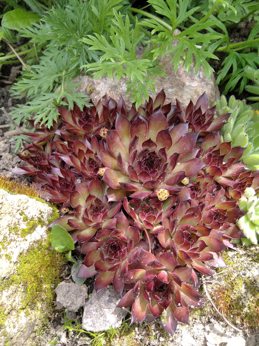 Это название нравится мне больше чем "молодило", его склонять легче. У меня пять сортов. Четыре были куплены прошлой весной на Авито и посажены в рокарий. Прошёл год... Красное вырастило много деток у себя под боком. Цвет яркий, мне нравится. И не разбегается. Крупное красно-зеленое сначала нравилось мне больше всех. Но стало плохо себя вести: выстреливает палками с деткой на конце и притесняет другие растения. Приходится убирать. Я уже три розетки перенесла в свою новую скалку. Правда, там пока чистый песок, вряд ли будут расти. Ну, посмотрим. Одно из зелёных в этом году вдруг стало расти вверх и теперь совершенно не похоже на себя прошлогоднего, выглядит как очиток. Ещё одно зелёное быстро размножается, причём детки хоть и мелкие, но как-то ухитряются убегать далеко от родителя. Пятый экземпляр дочь привезла с Селигера. Там они росли в сосновом лесу. Я решила создать ему похожие условия. Сосен у меня нет, но шишек еловых набрала и посадила в полутень. Два последних похожи, пра