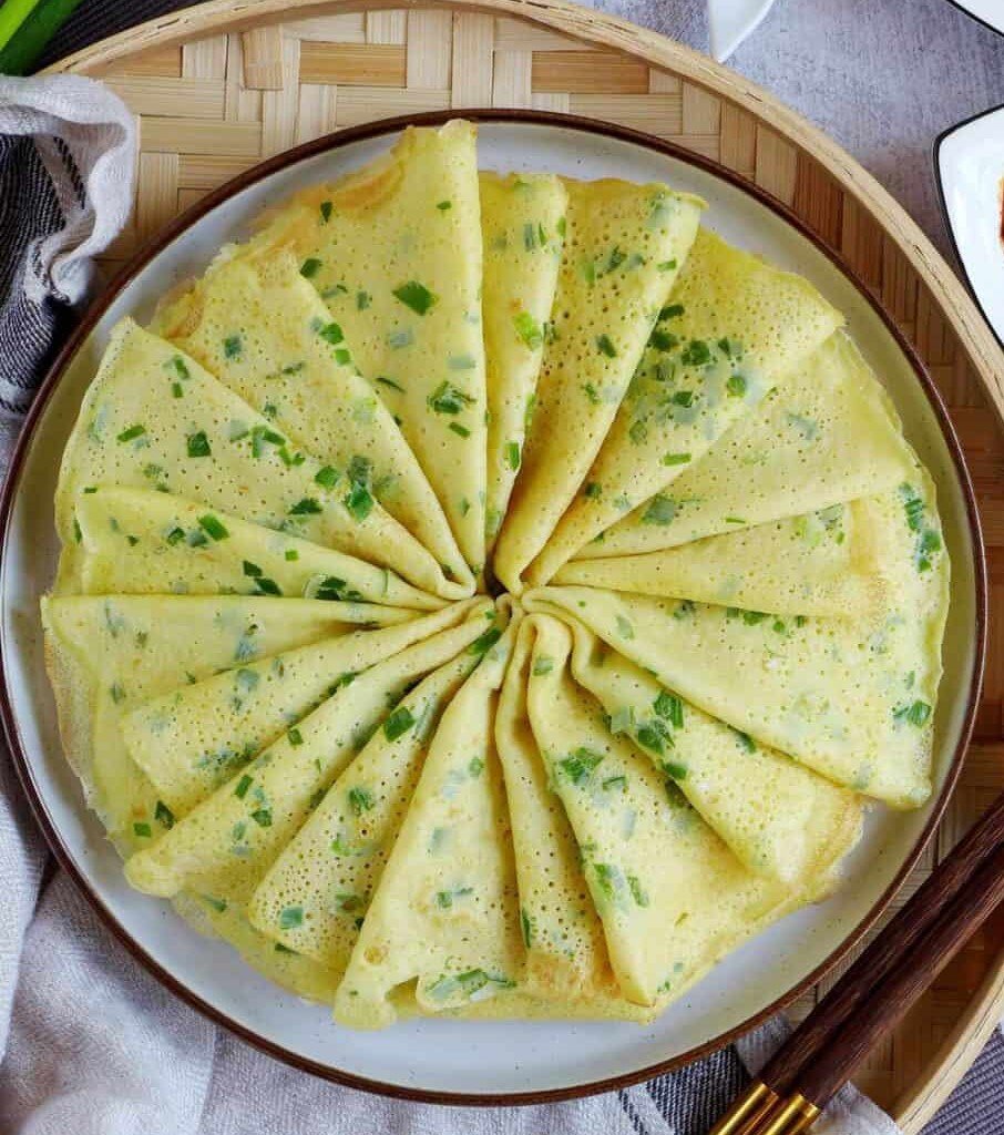 Простое блюдо с великолепным вкусом и текстурой. Блинчики с яйцом и зеленым луком - популярный китайский завтрак, требующий минимального количества ингредиентов и приготовления. Ингредиенты ( на 9 блинчиков, диаметром 18 см): После замешивания тесто должно получиться довольно жидким, чтобы свободно распределяться по сковороде, но не настолько жидким, чтобы блинчики легко рвались. Чтобы повысить эффективность замеса, я предлагаю вам сначала смешать муку и воду до получения однородной массы, прежде чем добавлять яйца. Если сначала смешать муку с яйцами, то, как правило, получается больше комочков, для растворения которых требуется больше усилий. Как только вы приготовите тесто , готовить его просто и незатейливо: налейте немного теста на горячую сковороду / сотейник и придайте ему тонкую круглую форму. Готовьте с обеих сторон, пока они слегка не подрумянятся. Готовьте с обеих сторон, пока они слегка не подрумянятся. Подавайте их в простом виде или с соусом. Приятного аппетита !!