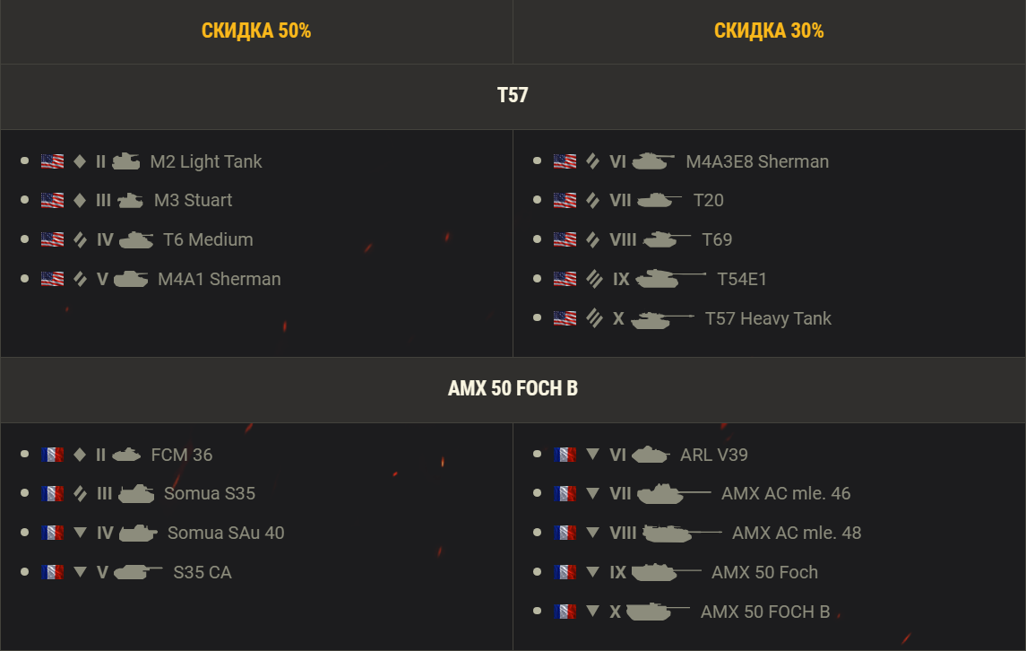 В июне героями акции станут неудержимый американский ТТ-10 T57 Heavy Tank и грозная французская ПТ-10 AMX Foch B. Воспользуйтесь скидками на исследуемую технику, боевыми задачами и специальными предложениями, чтобы ускорить свой прогресс и полностью исследовать ветки американских тяжёлых танков и французских ПТ-САУ. Акция продлится до 5 июля, 08:00 (МСК), а значит, у вас есть время, чтобы исследовать обе ветки. Если же вы хотите ускорить процесс и исследовать технику высоких уровней быстрее, взгляните на наборы с бонусами, доступные в Премиум и внутриигровом Магазине до 20 июня, 8:00 (МСК).