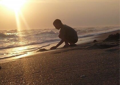 он увидел мальчика, который выкопал ямку в песке и переливал в нее воду, зачерпывая раковиной из моря.