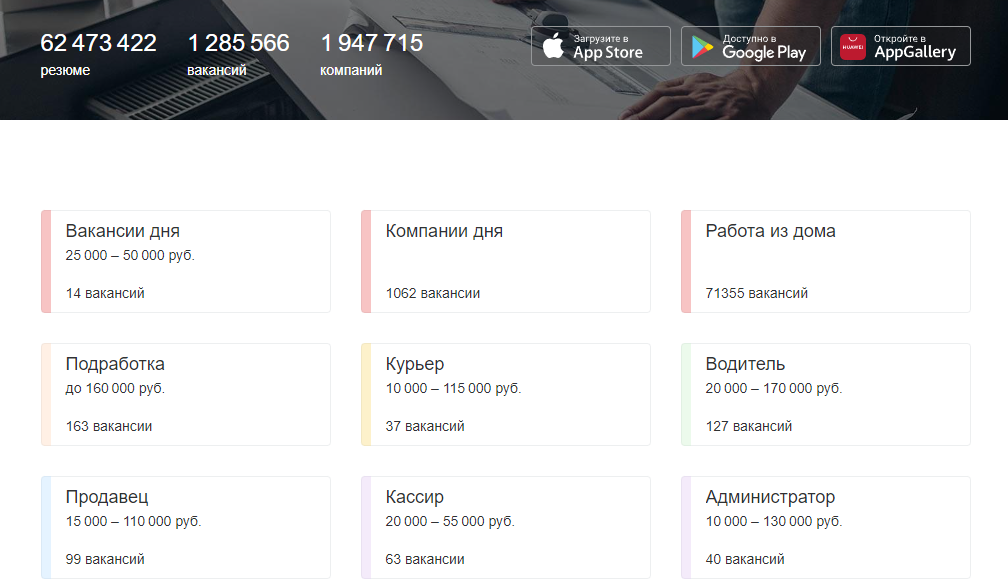 Современные технологии облегчают нам жизнь во всем, в том числе и в поиске работы. Обилие интернет-ресурсов позволяет в считанные часы просмотреть сотни вакансий и выбрать наиболее подходящую из них. Я собрал для вас небольшую подборку основных работных ресурсов, коротко обрисовав их плюсы и минусы. Итак, сайты, где можно найти работу. HH.ru, или Headhunter Сайт, который на слуху практически у всех. Ежемесячно здесь выкладывается около 500 тысяч вакансий. Сейчас в базе 62 миллиона позиций. Ресурс может похвастаться широкими возможностями: удобная и понятная форма составления резюме, услуга составления такового, репетиция собеседования, годные фильтры, тест на профориентацию и другие полезные сервисы для соискателей. Сложно сказать, чего здесь нет. Модераторы стараются проверять работодателей, однако я лично видел там (как и везде) сомнительные варианты. Поэтому будьте бдительны, мошенники легко маскируются под адекватные компании.