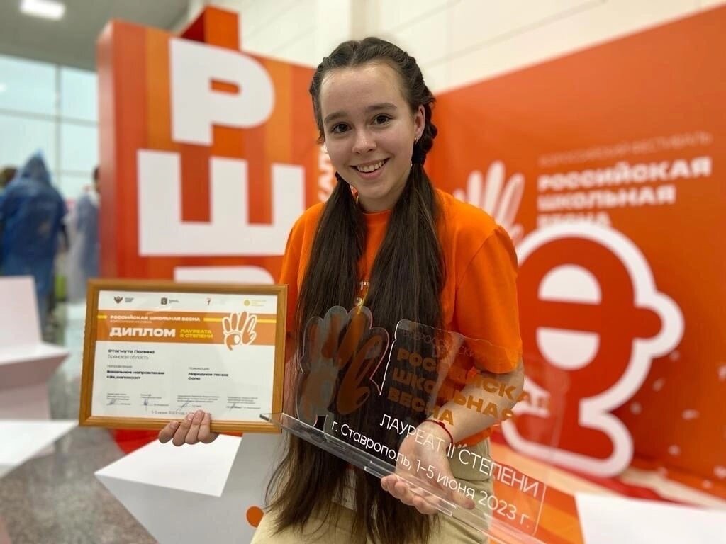 Исполнительница народных песен из города Унеча Брянской области Полина Стогнуто успешно представила регион на первом Всероссийском фестивале творчества «Российская школьная весна». Он проходил с 1 по 5 июня в Ставрополе. В течение двух дней на фестивальной площадке в различных номинациях было представлено более 350 номеров. Брянская певица Политна Стогнуто выступала в номинации «Народное пение». Жюри отметило ее выступление, голос и манеру исполнения, присвоив звание лауреата II степени. О талантливой унечской школьнице «Брянская Губерния» рассказывала в этом году. Девушка стала героиней программы «Ты в кадре», которая вышла в эфир в феврале этого года на нашем телеканале. Тогда она покорила московское жюри конкурса «Хрустальные звездочки» исполнением песни «Эх, сапожки». Получила специальный приз «Открытие» премии Иосифа Кобзона. Награду брянской исполнительнице вручила жена мэтра Нелли Кобзон. В свои 15 лет Полина уже не раз становилась лучшей исполнительницей на многих всероссийских