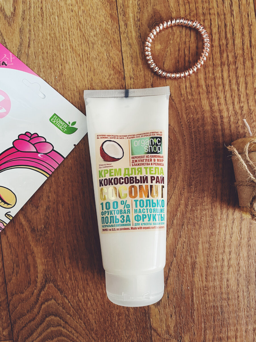 Сейчас я пользуюсь кремом от “Organic shop” с кокосом. Это просто потрясающе! Кожа выглядит увлажненной и ухоженной.