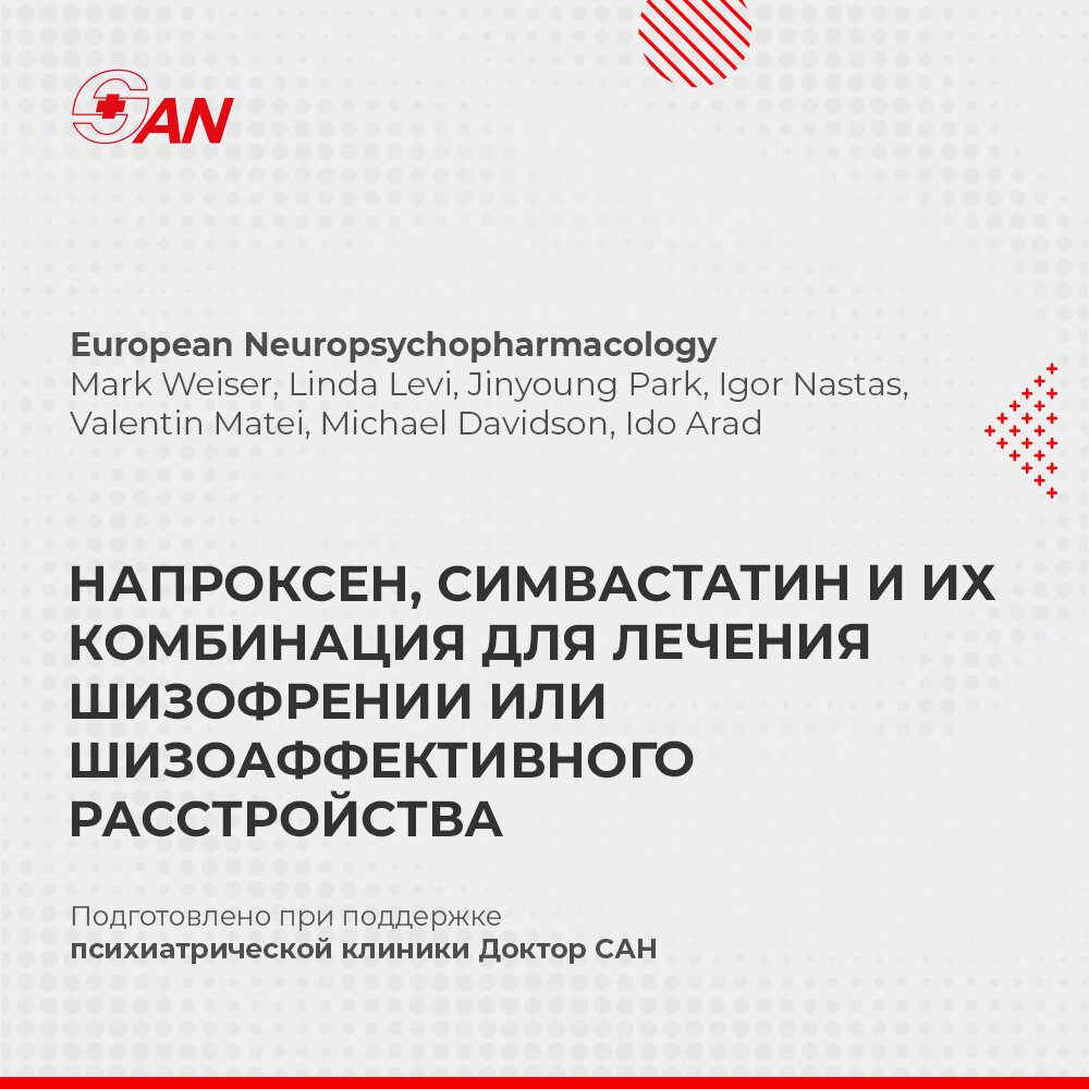 В крупном рандомизированном контролируемом испытании изучалось влияние напроксена (нестероидный противовоспалительный препарат), симвастатина (гиполипидемическое лекарственное средство) или обоих препаратов у пациентов с шизофренией. Между всеми группами не было обнаружено статистически значимых различий между препаратом и плацебо по подшкалам PANSS, CGI или BACS. Наблюдалась тенденция к значимости к улучшению показателя негативных симптомов, анализ факторов PANSS выявил значимое улучшение при отмене симвастатина по сравнению с плацебо. Однако результаты не были значимыми после поправки на множественные сравнения. Метаанализ изменений общего балла PANSS в исследованиях статинов при шизофрении, включая настоящее исследование вместе с шестью другими, показал значимое улучшение при приеме статинов по сравнению с плацебо. Подробнее о лечении шизофрении: https://doctorsan.ru/lechenie-shizofrenii