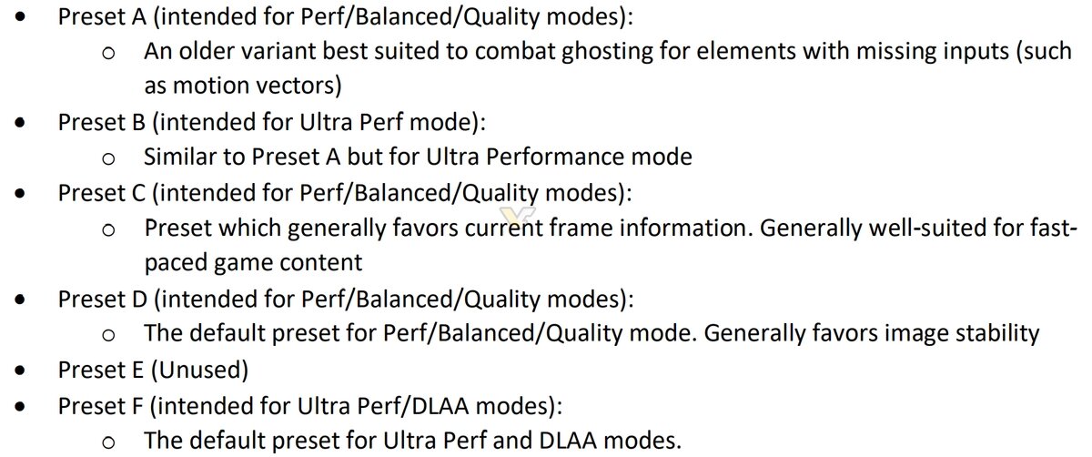 В Unreal Engine скоро станет доступен новый плагин NVIDIA DLSS, который также получит и новый пресет качества. Стоит уточнить, что пресеты не являются тем же самым, что и режимы качества, которые доступны пользователям в настройках у игр. При помощи пресетов технология адаптируется к контенту в игре и регулирует сценарии апскейла и подстраивается под определенные сцены и наличие/отсутствие векторов движения. В данный момент у DLSS есть шесть пресетов: Но в обновленном плагине для Unreal Engine был замечен новый пресет G. К сожалению, подробностей о нем у нас нет. Если вам интересно, то пресет F в данный момент считается самым высококачественным. https://youtu.be/lruUkEIRvQ8?t=2714