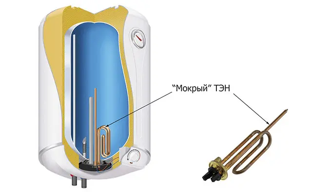 ТЭНы предназначены для преобразования электрической энергии в тепловую. Устройства устанавливаются в проточных и накопительных водонагревателях. По конструкции различают две группы нагревательных элементов — «сухие» и «мокрые» (погружные). В этой статье рассмотрим преимущества и недостатки обоих видов. «Мокрые» ТЭНы Нагревательные элементы такого типа представляют собой герметичную трубку (колбу) со спиралью внутри. Трубка заполнена сыпучим наполнителем. Часть, контактирующая с водой, изготовлена из меди, титана, нержавеющей стали или сплава с высокой теплопроводностью. Спираль производят из нихрома или другого материала с высоким электрическим сопротивлением. Нагревательный элемент погружается в воду, поэтому ТЭНы называют «мокрыми». Устройства часто объединяют в группы по несколько штук на общем креплении. Группы нагревательных элементов промышленных бойлеров объединяют в ступени мощности, подключенные к одному контактору. Такое решение используется в водонагревателях с ТЭНами серии