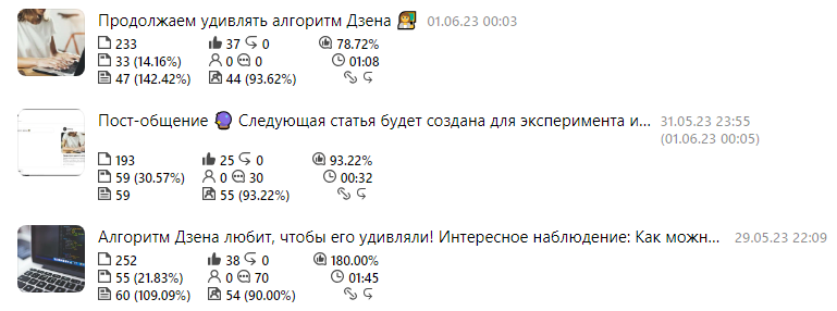 Здравствуйте дорогие читатели! Вы на канале OKblog, и сегодня я, как и обещала, делюсь подробными результатами своего эксперимента. Для тех, кто пропустил мой эксперимент я вкратце объясню: по моим наблюдениям отключение/включение комментариев на публикациях формата "Пост" влияет на количество показов и я решила проверить это наблюдение на публикациях формата "Статья". Я опубликовала экспериментальную статью с отключенными комментариями, вот она: А для обсуждения создала отдельный пост-общение (тут комментарии включены), вот он: С момента начала эксперимента прошло 11 дней и я думаю, что данных уже хватает для выводов. Но сначала посмотрим на статистику экспериментальной статьи, поста-общения и для наглядности в сравнение ещё возьму статью, которая вышла немного раньше на одной неделе вместе с экспериментом. 1. Статья-эксперимент (без комментариев): Показы - 233 показа Дочитывания - 47 прочтений Лайки - 37 лайков Оплата - 183 рубля 87 копеек 2. Пост-эксперимент (с комментариями): Пока