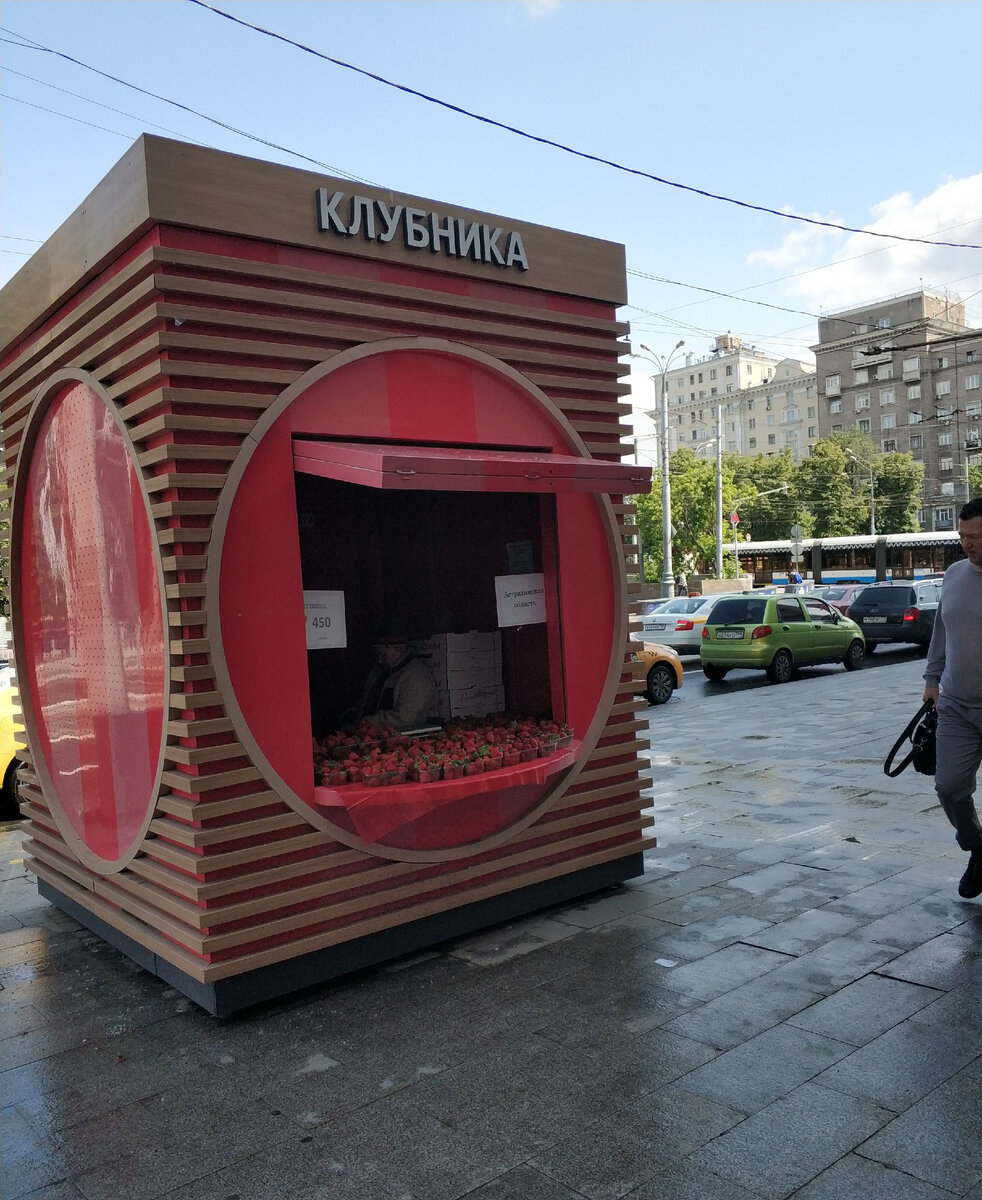 Добрый день. Вчера не писала по причине отсутствия новостей. Сегодня их тоже немного. Поведаю только том, что в столице нашей Родины в этом году выпустили на улицы города вот такие палаточки Ну, чтоб сразу, издалека видать было, что тут фрукты продаются. Вывеска может быть будет меняться, а может и нет. Расточительно эти конечно : ради клубники такие коробочки выпускать, а в нынешнее время, так вообще зазорно. Обходились же до сего дня , ничего, не жаловались. Вот , собственно, и всё пока. Всем мира и хорошей недели.