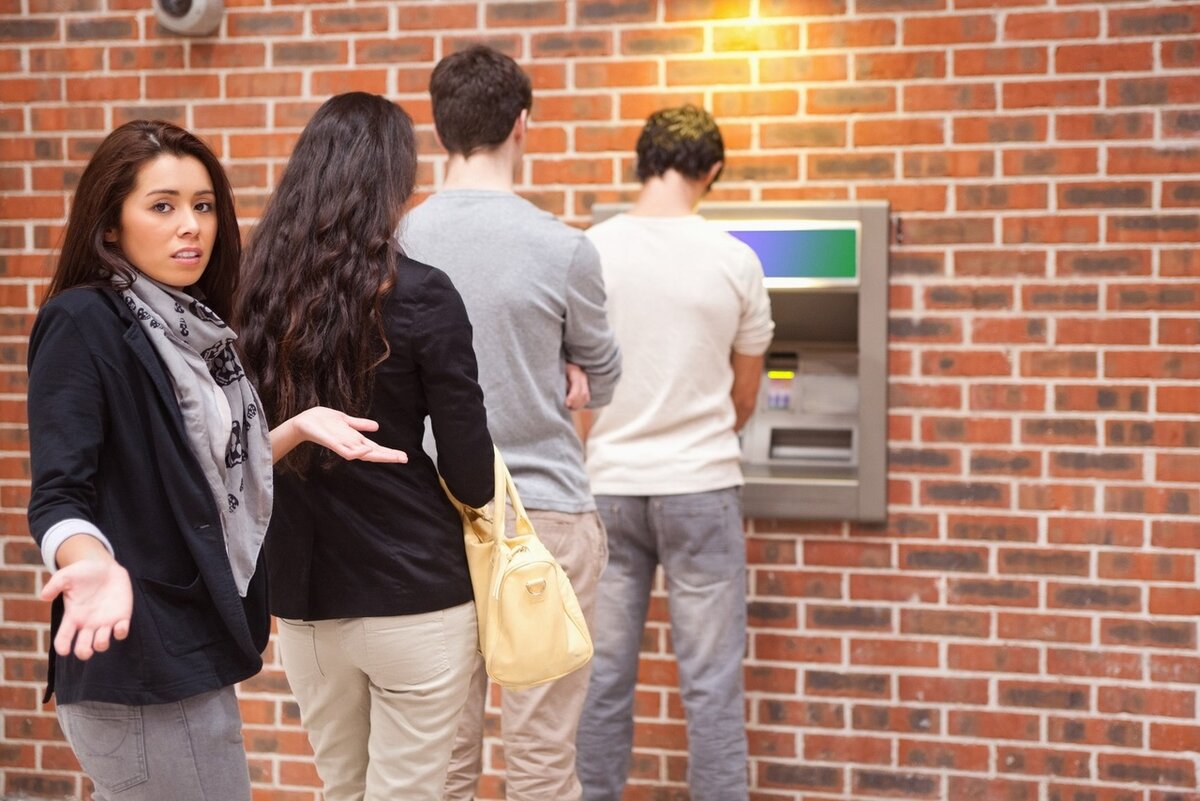 Банкоматом пользовался мужчина и в очереди стояла всего одна девушка. Я объяснила ей ситуацию и попросила пропустить меня без очереди. На что девушка категорично ответила, что она стоит долго и не намерена никого пропускать. Обычно сочувствие побуждает людей в таких случаях идти навстречу, и мне была непонятна ее раздражительность. Постояв всего минуту в очереди, я поняла в чем дело. Оказывается, мужчина, стоявший у банкомата, держал в руке пачку денег и не торопясь вносил всего по две купюры. Каждый раз он набирал пин код заново. На предложение положить всю пачку сразу, чтобы ускорить процесс, он грубо ответил: "Это моё дело, а ваши дела - в