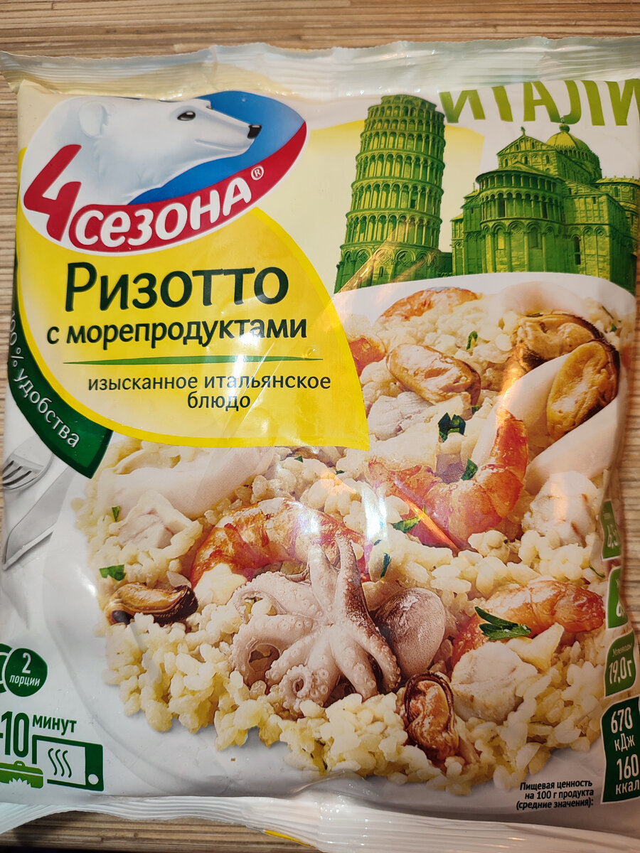 Любите ли вы морепродукты, как люблю их я? Поэтому я заказала данную замороженную смесь от 4 СЕЗОНА. Ризотто с морепродуктами – это одно из самых популярных блюд итальянской кухни. Оно готовится из риса и морепродуктов, обычно креветок, мидий и кальмаров. Подается горячим, иногда можно добавить оливкового масла и пармезан. В составе нет абсолютно ничего лишнего, все подобрано идеально: Рис приготовленный (рис, вода), филе минтая нарезанное, лук репчатый, осьминоги потрошеные баланшированные, кальмары атлантические потрошеные нарезанные бланшированные, мясо мидий вареное, креветки тихоокеанские очищенные бланшированные, вода, рыбий жир, растительное масло, сухое молоко обезжиренное, пряности, специи, соль поваренная. На обратной стороне упаковки указан состав и способы приготовления данного блюда. Тут их 2: можно в сковороде, можно в СВЧ. Для меня подходящий вариант был на сковороде. Смесь имеет большой срок хранения, потому что она замороженная. Заморозка у данной смеси шоковая, мы вид