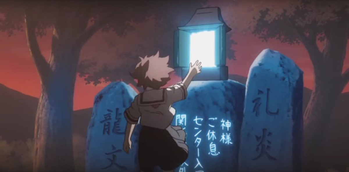 Девочка оказалась на пирсе, где она нашла лодку с енотом-гребцом. Тот её подвёз в город, где живут боги, и который чем-то похож на Венецию! А по численности населения, судя по тому, что в синтоизме божеств всего 8 миллионов (или мне так кажется?), больше Санкт-Петербурга. Но там Ясиму Юриэ не нашла, так что ей пришлось идти в храмовый комплекс с неким подобием трибуны. Там она и встретила того, кого искала. Ясима, оказывается, репетировал. Он хотел стать рок-звездой, и даже побывать в Токио. Ясиму всё-таки удалось вернуть в храм семьи Саэгуса, но тот начал периодически вселяться в Мицуэ. Это было во 2-й серии