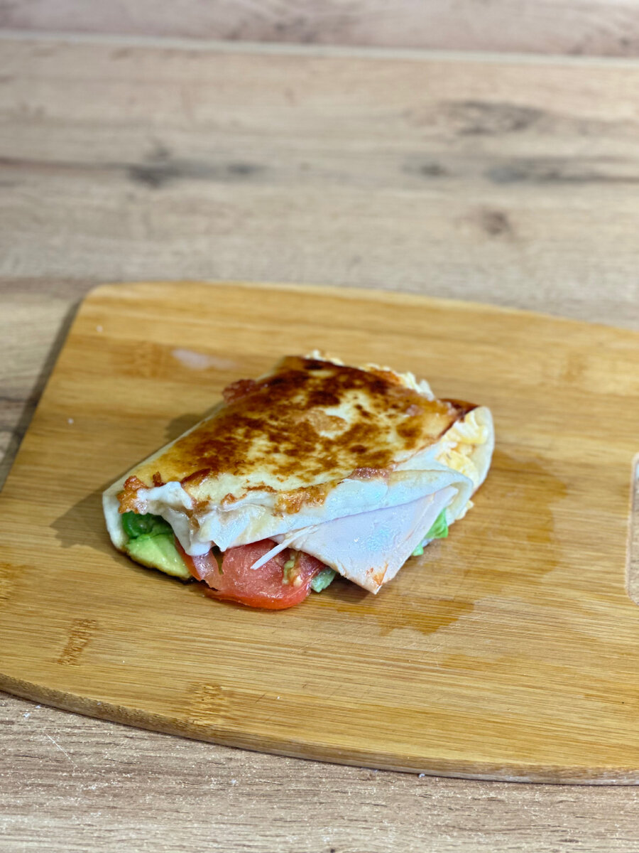 Я, на самом деле, редко готовлю такие завтраки в лепешке, но уж очень захотелось попробовать. Если понравился рецепт, обязательно делитесь с друзьями;). Готовим: 1. Лепешку режем с одной стороны, начиная с середины. Именно с этого места пойдет «сворачивание». 2. Добавляем любых 4-5 ингредиентов. У меня это: скрэмбл, моцарелла, ветчина из индейки, помидор и авокадо. Комбинация более чем удачная на мой взгляд. 3. Сворачиваем лепешку и жарим с каждой стороны на среднем огне примерно по 30-40 секунд на небольшом количестве масла. А в итоге получается хрустящая лепешка, с тянущимся сыром, нежным скремблом, свежим помидором, сочным авокадо и ветчиной из индейки. Ингредиенты: тортилья (или круглый лаваш) 1шт, авокадо 1/2шт, для скрэмбла яйца 2шт и щепотка соли, моцарелла 1ст.л, бекон/ветчина 1-2 кусочка и помидор 1 слайс