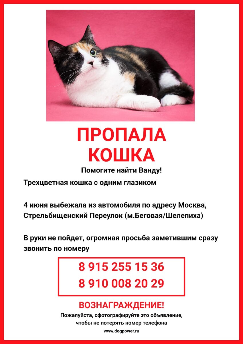 Трехцветная одноглазая кошка выбежала из машины 4 июня по адресу Москва, Стрельбищенский переулок, 30 (м.Беговая/Шелепиха)