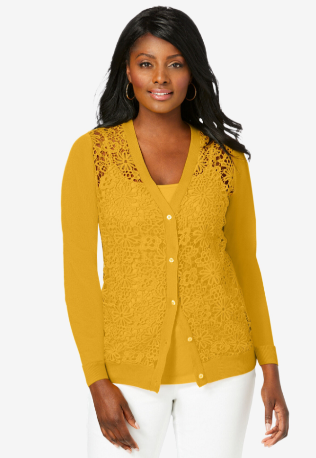 Схем, к сожалению, нет. Все взято с известного зарубежного сайта. Стало очень интересно: а какой трикотаж предлагается "там" для женщин с шикарными размерами? Как решается вопрос "спрятать проблемные зоны"? Какие фасоны и приемы в тренде? Смотрим. Это комплект: топ и кардиган. Написано, что полочки кардигана выполнены крючком. Все же больше похоже на машинное вязание. Но как идея, очень даже красиво, полочки можно связать в технике ирландского кружева. Легкая летняя кофточка. Подобрана в тон к платью. Красивые ромбовидные ажурные узоры, короткий рукав, укороченная длина, изящные маленькие пуговки застежки - легкость сквозит во всей кофточке. Из большого - только размер. Кружевной кардиган из мотивов. Крупными цветочными мотивами связана только полочка. Спинка кардигана выполнена красивой и простой сетчатой вязкой. Большие ракушки украшают закругленные края полочек кардигана и низ коротких цельновязанных рукавов. Пуловер с открытыми плечами. Спицами выполнен красивый узор "елочка". Ни