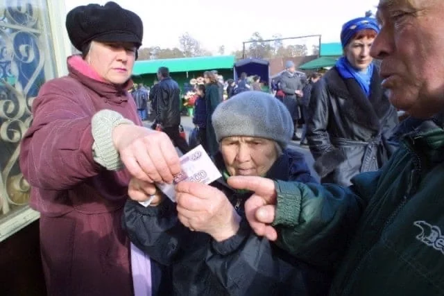 Прохожие помогают бабушке проверить на подлинность её месячную пенсию, выданную новой деноминированной купюрой, 1998 год.