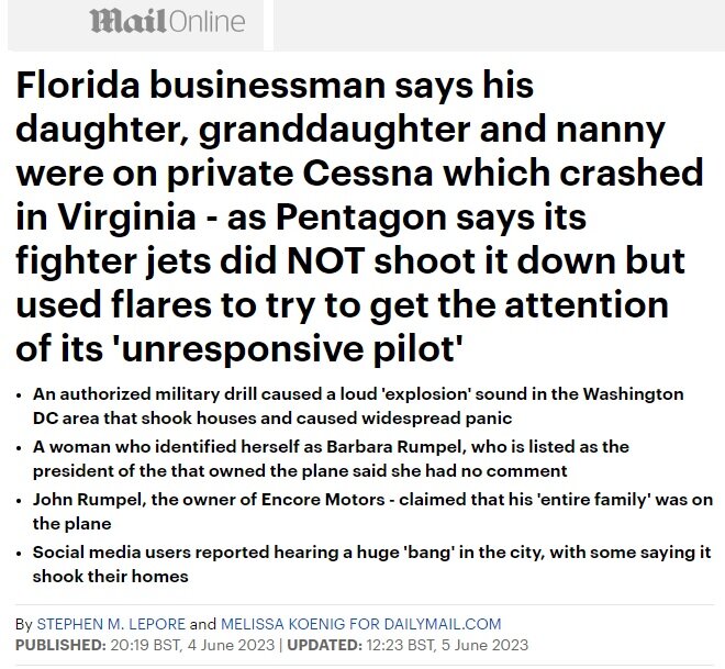 Ну, давайте, в очередной раз расскажите мне, какая это "высокотехнологичная" страна - Америка. Та, самая, мировой лидер по количеству грунтовых дорог и деревянных столбов. И в которой на 10% меньше людей с высшим образованием, чем в России, даже учитывая "утечку мозгов". Ну, пока готовитесь, я вам расскажу свежую историю из США. На сайте Daily Mail позавчера опубликована достаточно большая заметка с заголовком "Florida businessman says his daughter, granddaughter and nanny were on private Cessna which crashed in Virginia - as Pentagon says its fighter jets did NOT shoot it down but used flares to try to get the attention of its 'unresponsive pilot'". Там всё расписано так зализано и аккуратно - дескать, самолёт, принадлежавший небольшой авиакомпании крупного предпринимателя из Калифорнии, управляемый автопилотом, летел из Вашингтона в Нью-Йорк. И вот, когда он уже должен был приземлиться на Лонг-Айленде, по неизвестным причинам автопилот (напоминаю, мы с вами сейчас говорим, о самой "в