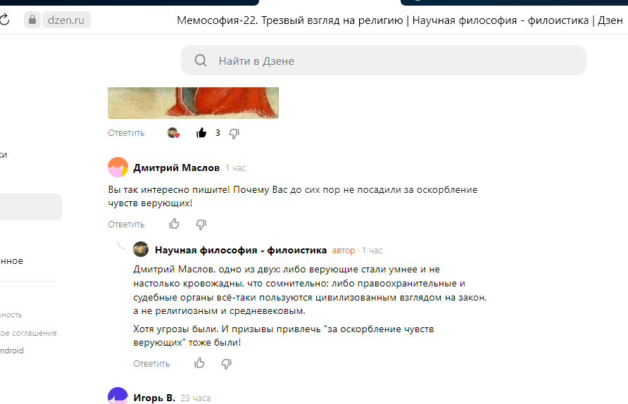 Вот к каким юридическим кульбитам приводит желание втиснуть в юридический документ неюридические понятия. Но зачем тогда вообще писать про чувства верующих и уделять им отдельную статью УК, если, оказывается, что данную статью можно трактовать и так, и эдак, и верующими (в присутствие или отсутствие чего-либо) являются вообще все люди, и закон должен защищать чувства каждого человека? Зачем городить огород на пустом месте, когда все действия данной статьи вполне умещаются в статью УК о хулиганстве и прочих правонарушениях, которые уже есть в УК и без 148-й статьи?