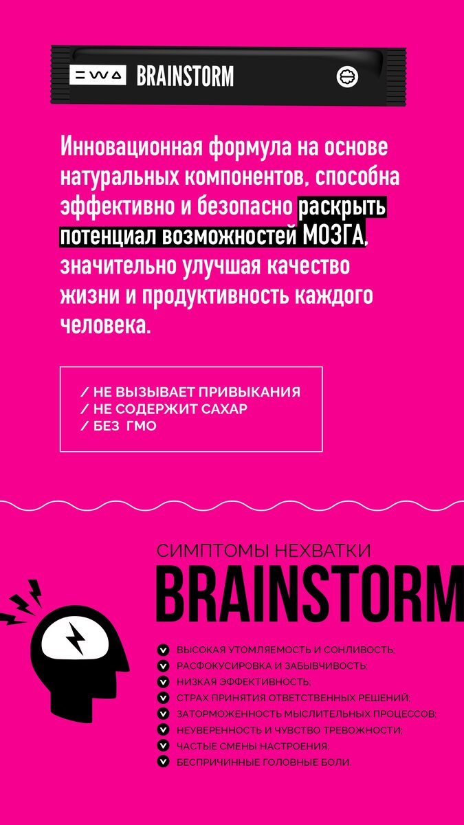 Описание и состав Брейншторм от ЭВА ПРОДАКТ Brainstorm - это флагманский продукт компании EWA PRODUCT, у которого нет аналогов на рынке. Brainstorm - это стимулятор работы головного мозга на основе натуральных компонентов, который помогает улучшить продуктивность. Теперь ты знаешь, что может помочь, если у тебя: Brainstorm от EWA PRODUCT стимулирует развитие памяти и внимания. А также помогает: И всему этому способствуют натуральные компоненты в составе Brainstorm от EWA PRODUCT. В основной состав Brainstorm от EWA PRODUCT входят: Ежовик гребенчатый мицелий 5 HTP (5-гидрокситриптофан) Готу Кола — «пища для мозга»