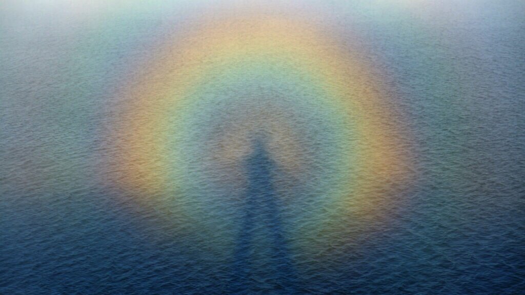 Глория представляет собой оптическое явление, которое проявляется в виде кольцевого свечения вокруг тени наблюдателя. Она обычно наблюдается в тумане или облачности, когда свет проходит через маленькие капли воды или льда и отражается обратно к наблюдателю.