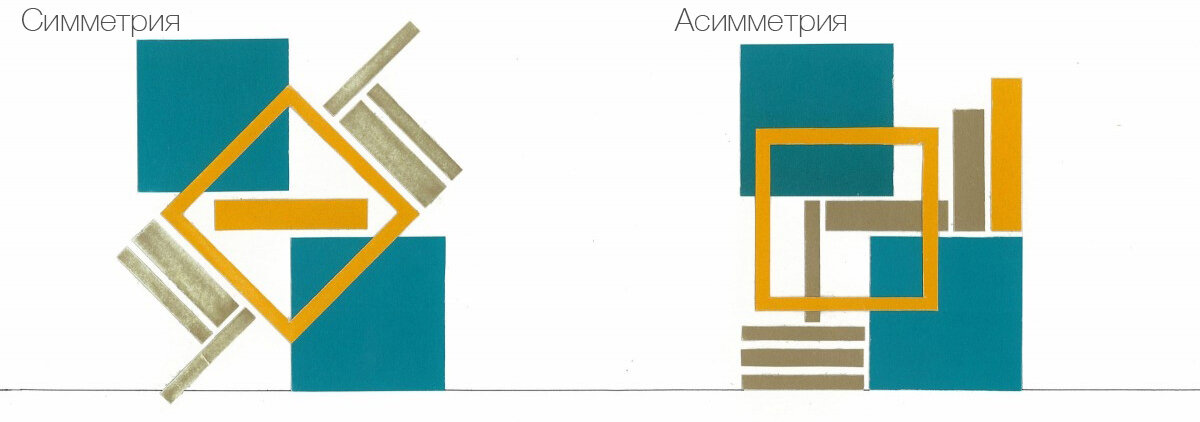 Симметрия связана с равномерным распределением элементов, в то время как асимметрия - с несимметричным распределением элементов на холсте.