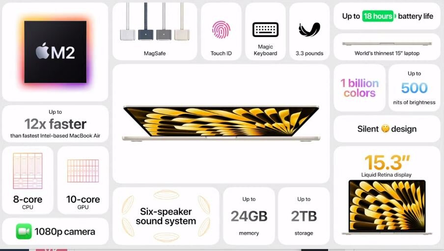 Была представлена новая линейка MacBook на ARM-чипах Apple. Во время презентации была продемонстрирована новая модель MacBook Air 13/15″ на дисплее размером 15,3″. Однако, под капотом этой новинки будет установлен не самый новый процессор Apple M2.