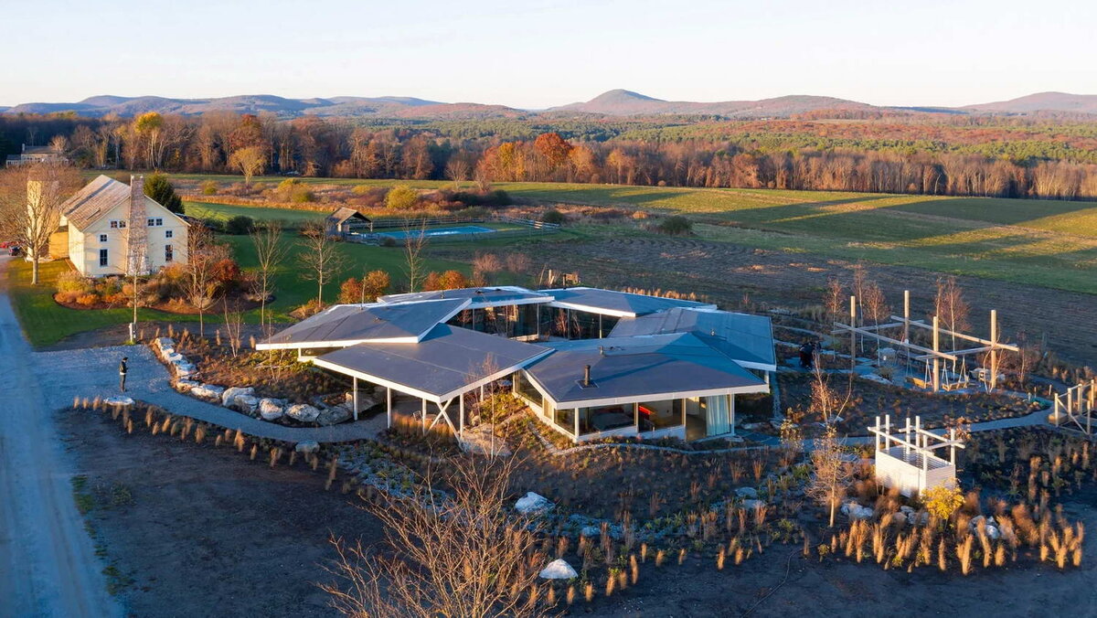 Цветочный дом расположен в Беркшире, живописном регионе, известном своими лесистыми холмами, богатыми сельскохозяйственными угодьями и культурными центрами. Дом для отдыха, который служил постоянным местом жительства во время пандемии коронавируса, был создан для супружеской пары с двумя детьми в возрасте 20 лет и одним сыном-подростком. Дом находится на территории, которую делят с родителями мужа, чей загородный дом на выходных в форме сарая находится выше по дороге. Обеспечение связи с природой было основной задачей проектной группы No Architecture, нью-йоркской студии, основанной архитектором Эндрю Хейдом (Andrew Heid). Черпая вдохновение из местности, а также из современных стеклянных домов, команда задумала серию прямоугольных объёмов с перекрывающимися крышами, которые организованы вокруг центрального шестиугольного внутреннего двора. Сверху дом напоминает очертания цветка, отсюда и название проекта. «Проект переосмысливает и расширяет типологию стеклянных домов за счёт её дина
