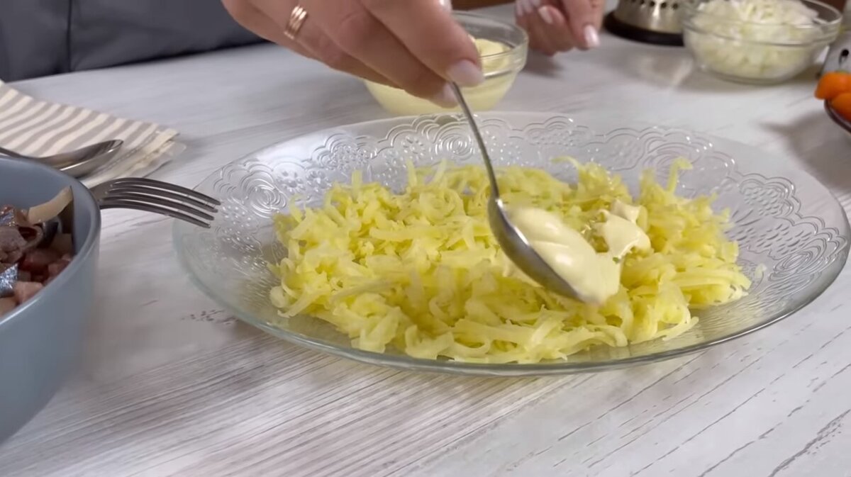 Селедка под шубой — один из моих любимых салатов. У каждой хозяйки свои хитрости его приготовления. Кто-то добавляет яблоко, кто-то маринует лук, кто-то не добавляет яйца. Но где бы и какой вариант я не пробовала, крайне редко попадается действительно вкусный (не в обиду хозяйкам). Поэтому решила поделиться с вами своими маленькими хитростями, которые помогают мне готовить этот салат вкусным всегда! Подробный процесс приготовления можно посмотреть в следующем видео,либо дочитать статью до конца: Читайте рецепт и готовьте вместе со мной: Селедку нарезаем на небольшие кубики. Так как она главный ингредиент в этом салате, не ленитесь и покупайте хорошую целую селедку, тщательно очищайте ее от всех косточек, чтобы они не попадались во рту. Не рекомендую брать пресервы и готовое филе сельди, т.к. они не самого лучшего качества. Хитрость 1: дно салатника, как правило, всегда меньшего диаметра. Поэтому, чтобы селедка была в каждой порции, на дно выкладываем тонкий слой тертого на крупной терк