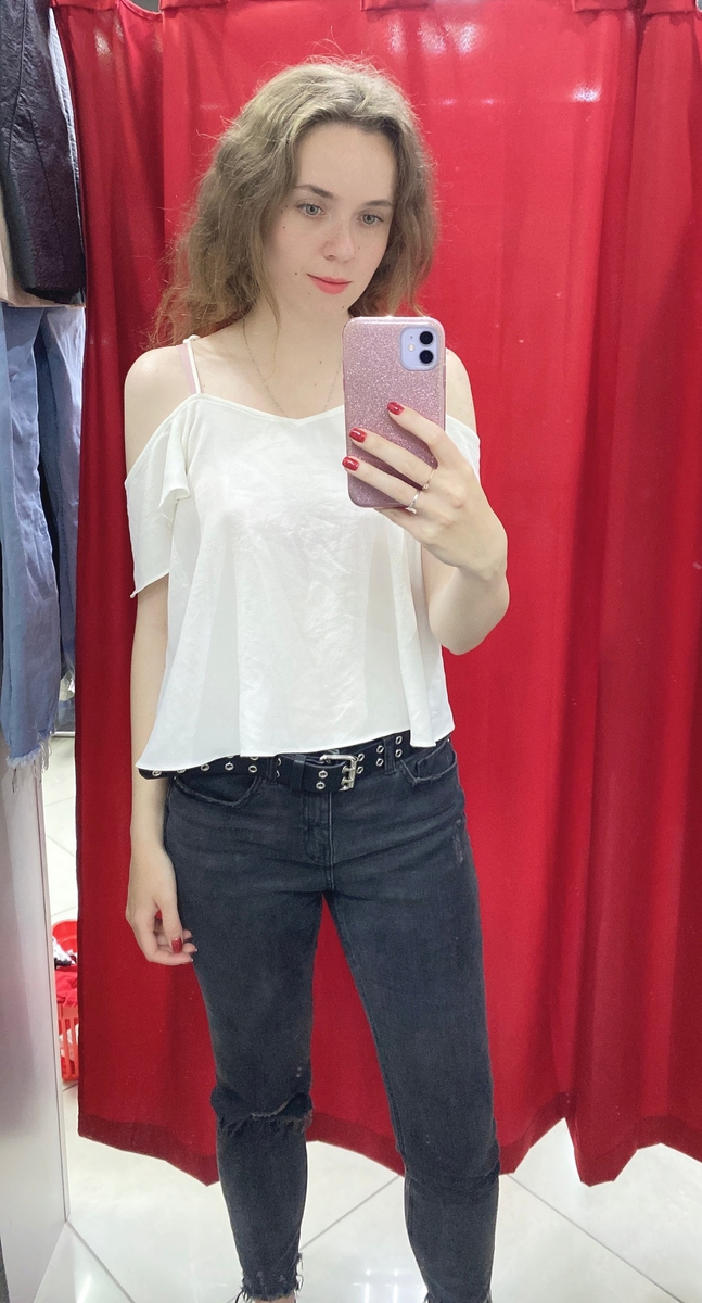 Сегодня я очень удачно сходила в секонд-хенд. Купила хорошую одежду, главное, которую я действительно буду носить. Не буду показывать все вещи, пока продемонстрирую шикарные джинсы скинни. Почему шикарные? Потому что сидят хорошо, отлично тянутся, поэтому носить их одно удовольствие. Я это знаю, потому как у меня есть такие же, но чёрные. Они тоже из секонда. Интересно то, что Настя тоже их купила ещё где-то полгода назад. Причём сначала одну пару, а затем - вторую. Они действительно очень комфортные, поэтому я замечаю, что она их постоянно носит. Я очень удивилась, когда мне попались такие джинсы, но в синем цвете. Вот так находка! Чтобы вы понимали, сначала покажу примерку топа. Плюс на мне как раз такие же чёрные джинсы. Впрочем, вы их уже могли видеть на многих других фото и видео. Они от Denim Co, качество действительно очень хорошее. Ношу их постоянно, самые любимые. Что касается топа, то он вроде нормальный, но как-то не впечатлил. Слишком на занавеску похож, а ещё очень просв