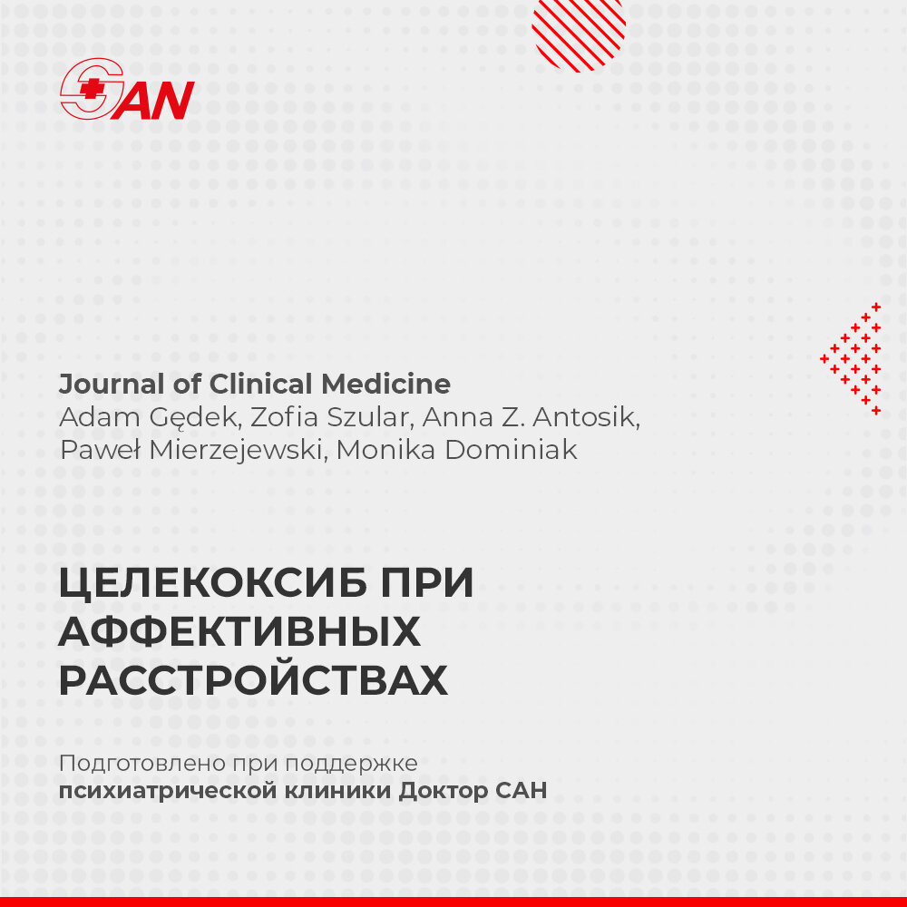 В систематическом обзоре и метаанализе обобщены имеющиеся данные о влиянии целекоксиба на широкий спектр аффективных расстройств и на воспалительные параметры. Обнаружены доказательства, подтверждающие антидепрессивную эффективность целекоксиба в дозе 400 мг/сут, применяемого в течение 6 недель в качестве дополнительной терапии при большой депрессии и мании. Антидепрессивная эффективность целекоксиба в указанной выше дозе при монотерапии также была подтверждена у пациентов с депрессией и сопутствующими соматическими заболеваниями. Не было обнаружено убедительных доказательств эффективности целекоксиба при биполярной депрессии. Целекоксиб в дозе 400 мг/сут, применяемый до 12 недель, оказался безопасным для лечения пациентов с аффективными расстройствами. Хотя связь между ответом на целекоксиб и параметрами воспаления была обнаружена в доклинических исследованиях, это не было подтверждено в клинических испытаниях. Источник: https://pubmed.ncbi.nlm.nih.gov/37240605/