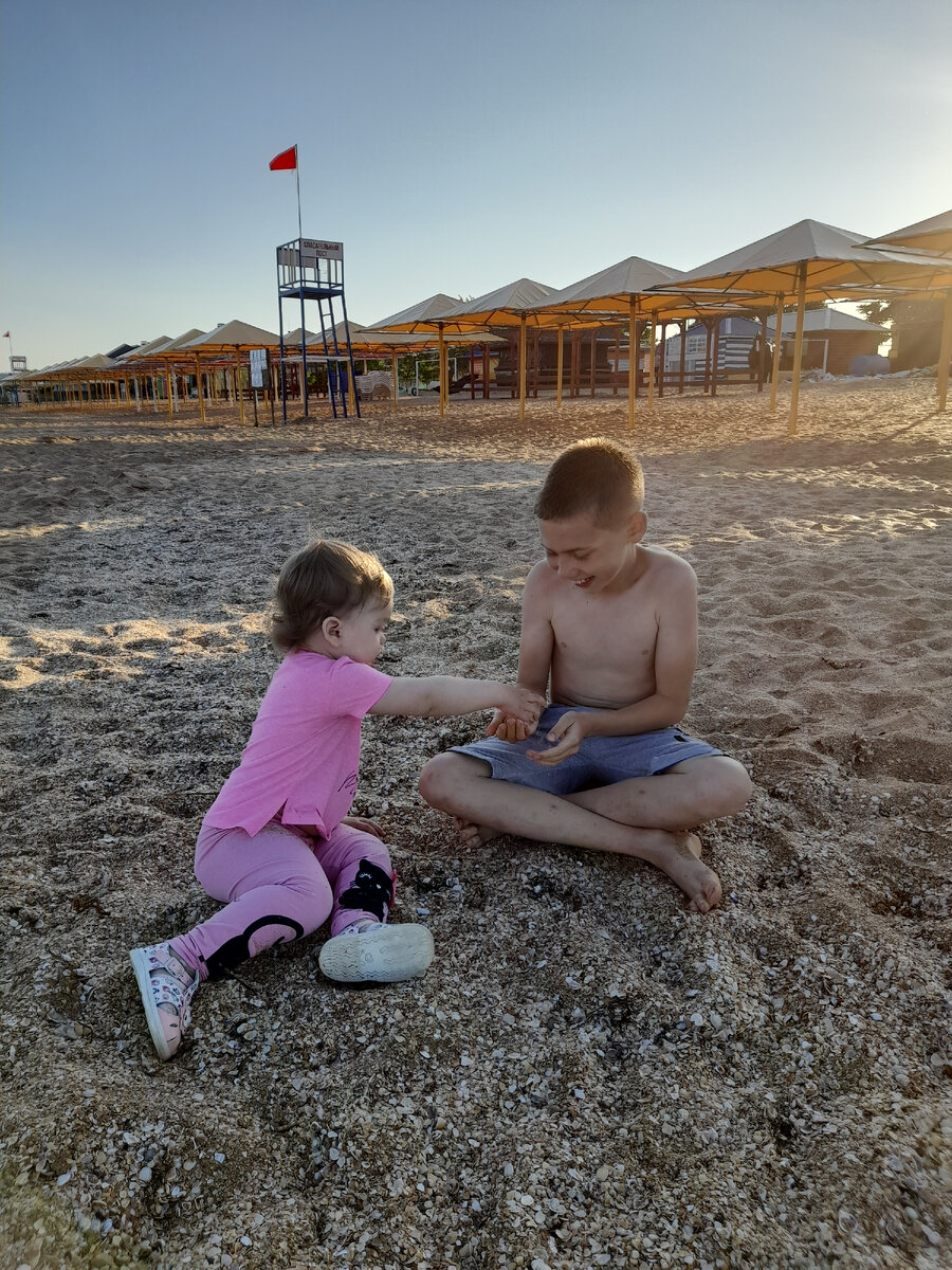 Приветствую👋👋👋 Мы наконец-то выбрались к морю все вместе, мама, папа, я и Ярик. При чём поездка сложилась спонтанно. Мы, с моей любимой вредной женщиной, собирались просто сходить в соседний двор на детскую площадку, но тут приехал папа...Я сразу же рванула в машину, уселась и сижу жду...Родители намёк поняли. Забрали Ярика с тренировки и поехали на наш любимый " Золотой пляж" в Береговое. Людей, надо сказать, на пляже пока не много. Оно и понятно, море +17, для нас холодое ещё. Единственный кто купался-наш Ярослав. Он давно уже сезон открыл, ещё в апреле. После школы делал уроки и бежал купаться. Рядом ребята играли в пляжный волейбол. Я, увидев мяч, пыталась принять участие. Игра застопорилась. Мама припятствовала моему активному участию в волейболе. Общими усилиями мамы и папы, они утянули меня оттуда. Далее меня снова ждало разочарование. Следом за Яриком зайти в воду мне не дали. Вот скажите, где справедливость? Почему одному можно, а другому нельзя? Везде нас, карапузов, у