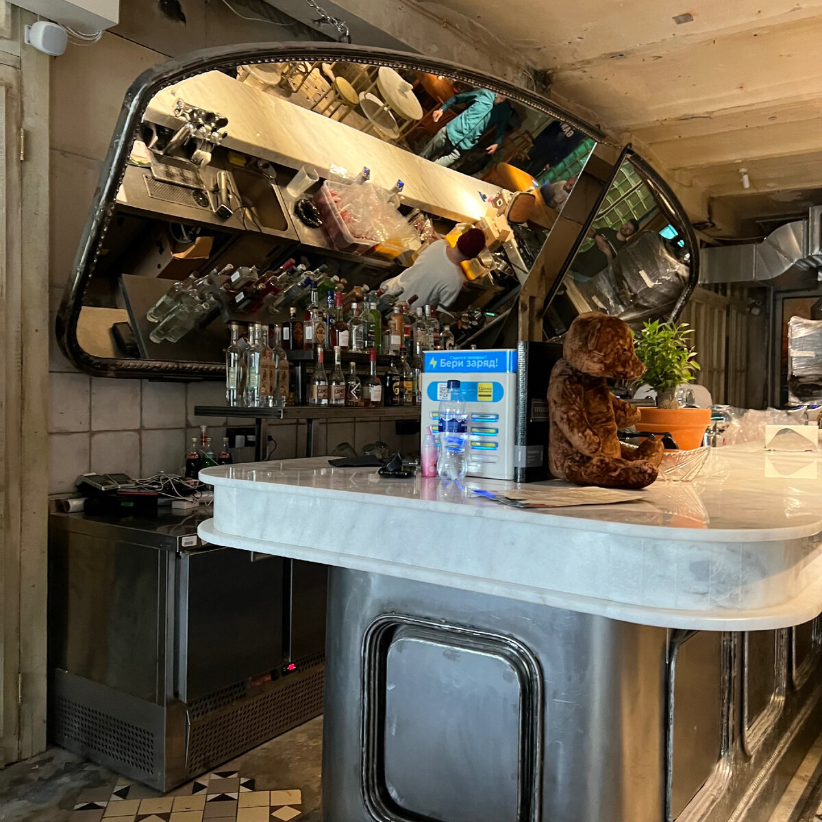 В арках напротив бара фрески с рабочими на советском курортном отдыхе. На полу плитка. Сверху своды старого потолка, к которому прикреплены светильники и металлические зубастые диски. Дальняя часть сложена из стеклоблоков.