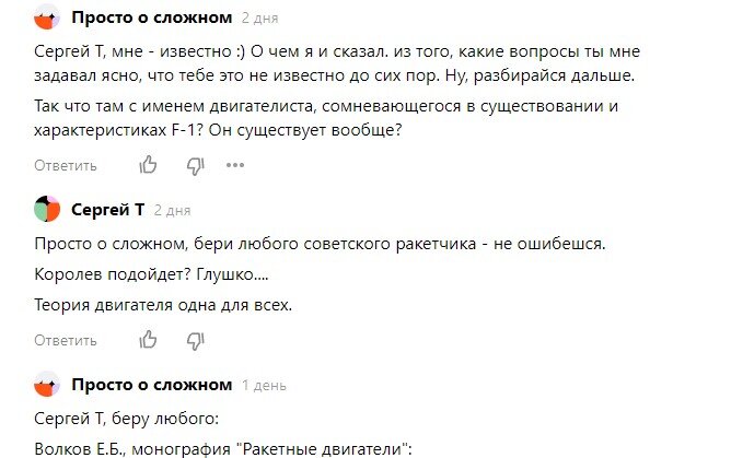 Не собирался возвращаться к этому вопросу, но тут - не могу пройти мимо. Ибо это... это... ну, даже не знаю, как назвать. Итак, недавний диалог: Казалось бы, разговор окончен. Но нет... такие крепости просто так не сдаются. Вы понимаете? Человек настолько не может признать свой промах, что готов мало что забыть о собственных словах о "любых ракетчиках", но и начисто дезавуирует советские учебники для вузов, монографии и даже ведомственные сборники. Особенно смешно с монографиями: он, видимо, не в курсе, что это такое. Напомню: согласно Государственному стандарту по издательскому делу (ГОСТ 7.60—2003, п. 3.2.4.3.1.1) монографией является «научное или научно-популярное издание, содержащее полное и всестороннее исследование одной проблемы или темы и принадлежащее одному или нескольким авторам». Что называется, Остапа несло... Вот такие вот у нас вести. Не скучайте. А история с камерой сгорания F-1 - она очень интересная, я ее скоро расскажу.