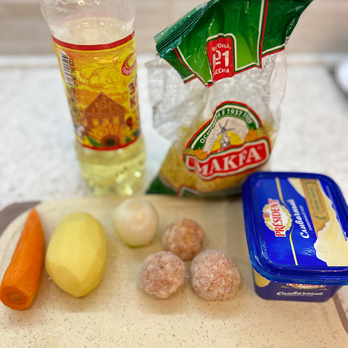 Сегодня готовим суп , который с удовольствием едят дети и их родители . Обожаю сочетания курицы и сливочного вкуса. Итак , что же нам понадобится : Ставим примерно 600 мл воды на огонь , первый делом закидываем фрикадельки . Снимайте пенку и после закипания варить на среднем огне . Нарезаем картошку кубиками или соломкой и добавляем к фрикаделькам . Добавляю специи по вкусу . Трем морковь на терке или мелкой соломкой , нарезаем лук репчатый и обжариваем на растительном масле до полуготовности , в конце обязательно добавьте кубик сливочного масла . 10 минут у нас покипела картошка , соединяю с зажаркой и варю на среднем огне 10 минут . После бросаем вермишель небольшую горстку ~ 1.5 ложки 3 минуты и завершающий штрих , будем добавлять плавленый сыр . У кого нет сыра можно остановиться на этом . Уже получилось очень вкусно ) Постепенно 2-3 столовых ложки размешиваем в кастрюле. Подавайте с зеленью или хлебом по вкусу . Приятного аппетита ❤️ Таким супом можно даже папу