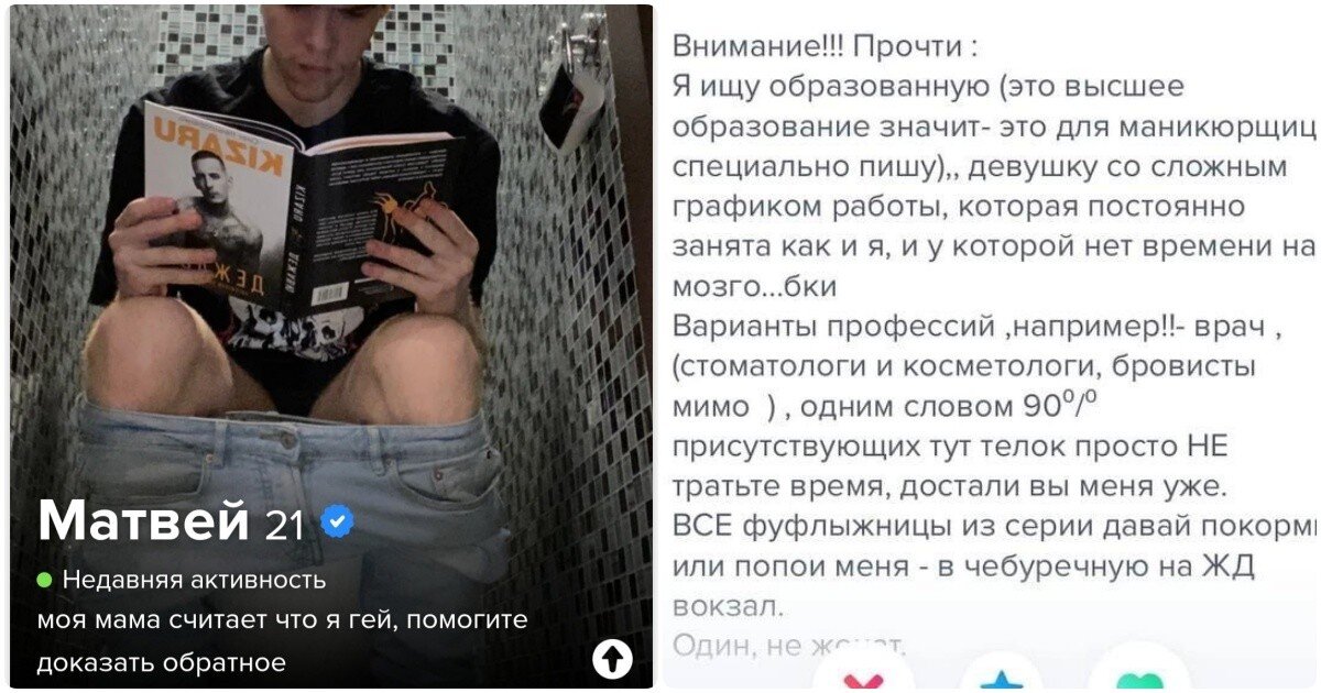 Что это мы всё про женские анкеты на сайтах знакомств говорим, сегодня пост с мужской версией. Меркантильные, странные и парни с запросами в этом посте. 1. Мужчина с запросами 2. Сразу видно, серьёзный мужчина Ищет "образованную", а посмотрите, как он пишет. Наверное, бросил школу и пошёл в стивыджобсы. Да, и чем ему стоматологи и косметологи не угодили? 3. Вот прям всех раскусил Он намекает на то, что сам стерва похлеще любой стервы или что? 4. Вот так Art Director! Он максимум директор по испанскому стыду 5. Не на помойке себя нашёл же Отвечает, как новая версия чата ЖПТ. 6. Это мама фотографировала На самом деле он написал "помогите доказать", а "обратное" это уже мама подписала. 7. Неплохой комплимент, кстати 8. Судя по общему фото и по тому, что один из них доминант, им надо к Матвею с шестого фото 9. Искусственно создаёт видимость большого спроса 10. Искусственно создаёт видимость высокого спроса 11. Это фейка Марата, наверное. Обратите внимание на "2 (два)" на предыдущем фото