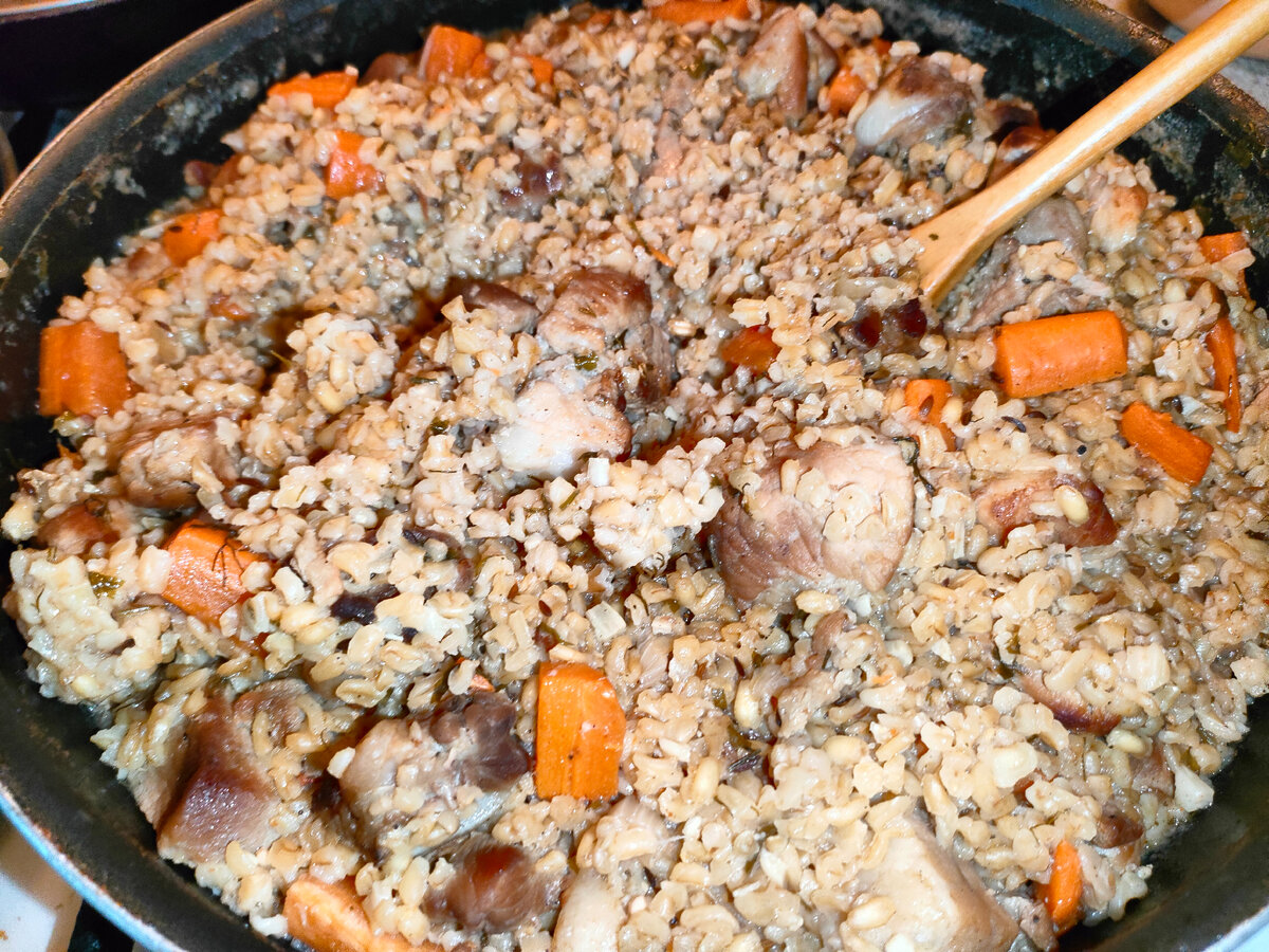 Опять надо было готовить 😁 Плов...Не хотелось, да и рис я не особо люблю. Ещё прикупила я тут по случаю на WB 5 кг булгура, по очень и очень приятной цене. Так что решила просто модифицировать рецепт того самого плова и получила булгур а'ля плов. Исходник. Где то кило - полтора мяса, у меня самая дешёвая свинина из Маяка. Нарезать средними кусками. 2 большие морковки - крупными брусками. У меня три маленьких или две средних, или одна очень большая луковица четвертинками. Зубчиков 6-7 чеснока порезать мелко (в этом одно из отличий от плова). Где-то две трети пол килограммовой пачки булгура, промыть раза три холодной водой. Итак. Приступаем к жарке. Отдельно обжарить до прозрачности чеснок, чуть добавив в сковороду растительного масла без запаха. В другой сковороде начинаем готовить зирвак. Поэтому, возьмите сразу глубокую. Наливаем растительное масло, хорошенько разогреваем, начинаем обжаривать мясо, добавляя небольшими порциями, что бы не сбить температуру. До золотистой короч