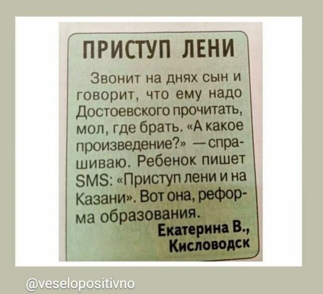 Среди присланного кем-то из знакомых попалась такая вот коротенькая заметочка. Она напомнила реальный случай из нашей жизни. Полярный, середина 90-х. Приходит сын - ученик 3 класса - из школы. Снимает ранец и говорит: «Мне нужно сходить в библиотеку. Завтра на чтение сказали ЧУЧЕЛО принести». Мы с женой озадачены: «Какое чучело? И почему из библиотеки?» Так как мы кроме одноименного фильма с Кристиной Орбакайте в главной роли никаких других шедевров с подобным названием не знаем… «Да книгу такую! Сказали в библиотеке взять!» - угрюмо бормочет сын и уходит. Мы остаёмся в недоумении. Может, с бесконечными реформами образования упустили что? Не помнится, чтобы фильм был снят по книге… Минут через 10 сын возвращается - библиотека находится практически в нашем доме. Он озадачен. Говорит: «Не нашли… С библиотекарем по картотеке посмотрели – нет такой книги!» Мы высказываем предположение: «Может, ты что-то путаешь?» «Да нет – говорит, - я в дневник записал, как учительница продиктовала». Смот