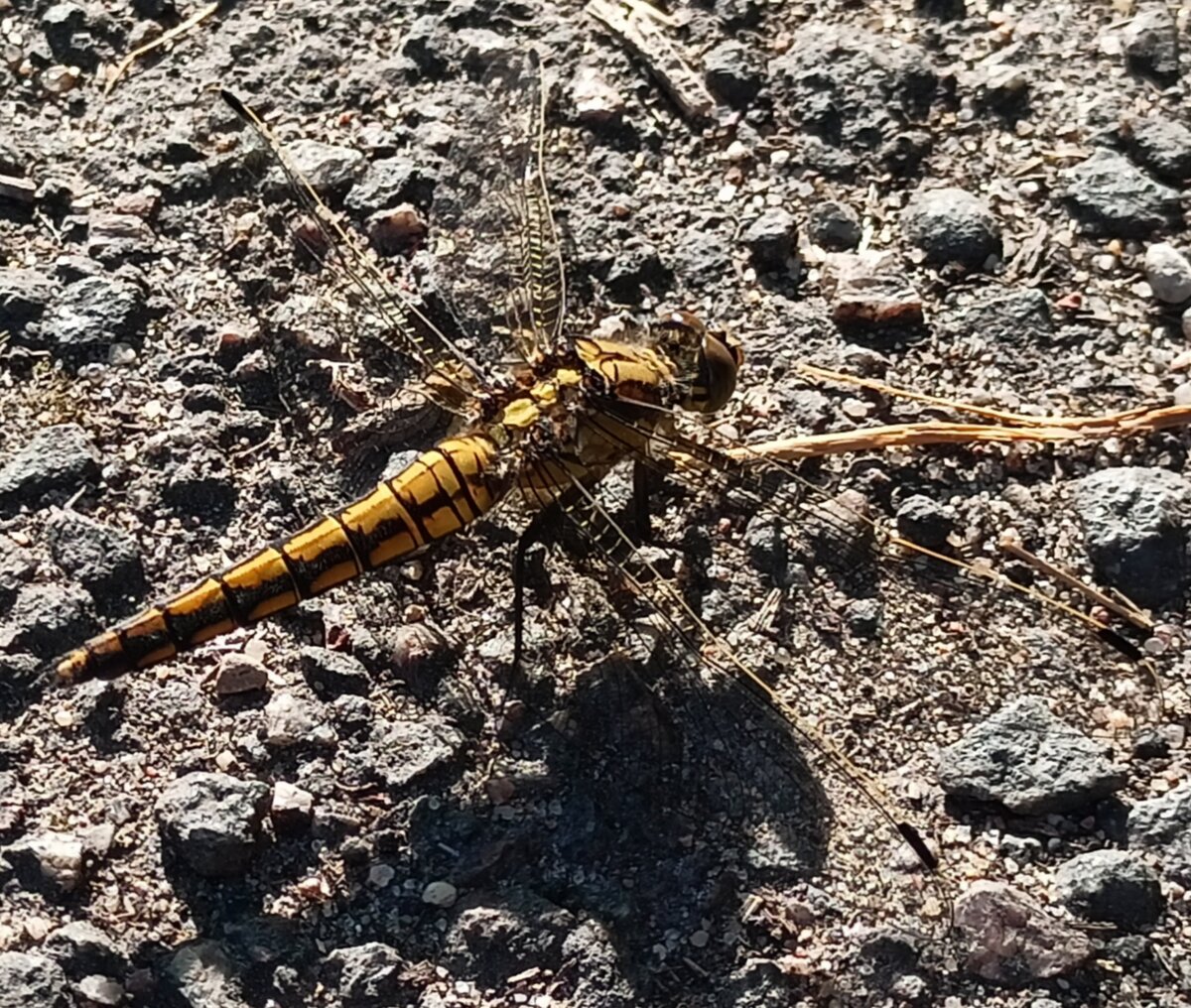 Стрекоза решётчатая, Стрекоза голубая, Прямобрюх решётчатый, Большая голубая стрекоза, Ортетрум обыкновенный, Orthetrum cancellatum. Вот сколько названий у этой стрекозы. Изначально обитатель Средиземноморья и тёплых широт Европы и Азии, эта красивая крупная стрекоза сегодня активно расселяется на север. Во многом это происходит благодаря человеку, который разрабатывая гравийные карьеры, оставляет обширные площади лишёнными растительности - именно то, что любит это насекомое. Длина стрекозы чуть больше пяти сантиметров, размах крыльев почти восемь. Обитает она вблизи озёр, прудов, медленно текущих рек и болот без прибрежной растительности. Самцы и самки появляются в июне и внешне различаются лишь цветом глаз - у самок глаза коричневые, у самцов - голубые. С возрастом у самцов брюшко покрывается голубым налётом, часть которого самки снимут во время спаривания, цепляясь за брюшко самца лапками. Взрослые самки становятся серо-коричневыми. Самцы Решётчатой Стрекозы территориальны