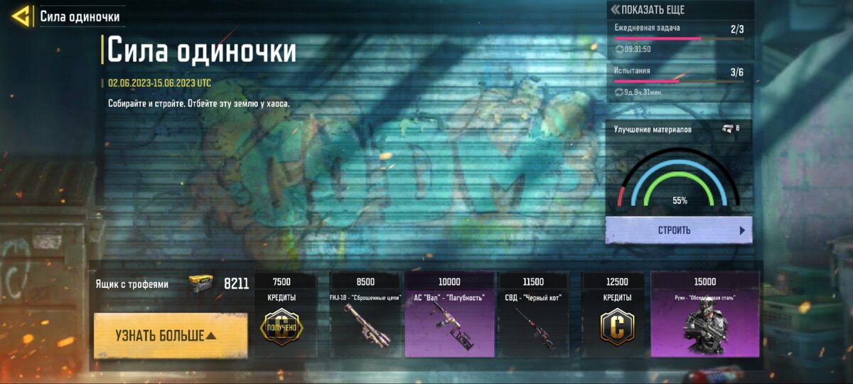 В четвертой (последней) части своего обзора на новый 5 сезон 2023 «Анархия» в Call of Duty: Mobile я хочу посмотреть на новые тематические, сезонные и актуальные задания и ивенты, проходя которые мы будем получать еще дополнительные косметические плюшки. Посмотрим на то, что они из себя представляют и стоит ли вообще играть в эти вещи и тратить время, чтобы все открыть. Итак, со стартом нового сезона нас встречает новый тематический сезонный ивент «Сила одиночки». Основными его наградами являются эпический чертеж на штурмовую винтовку АС Вал – «Пагубность» и эпический скин на персонажа Руин – «Обсидиановая сталь». Потратить время на прохождение данного ивента стоит, потому что награды стоят того, чтобы их забрать себе в коллекцию и побегать с ними несколько игр как в сетевой игре, так и в королевской битве. Тем более, как я уже сказал ивент временный и продлится со 2 июня 2023 по 15 июня 2023, так что поторопись. Из актуальных заданий у нас стало доступным «Дилемма подрывника». Доступн
