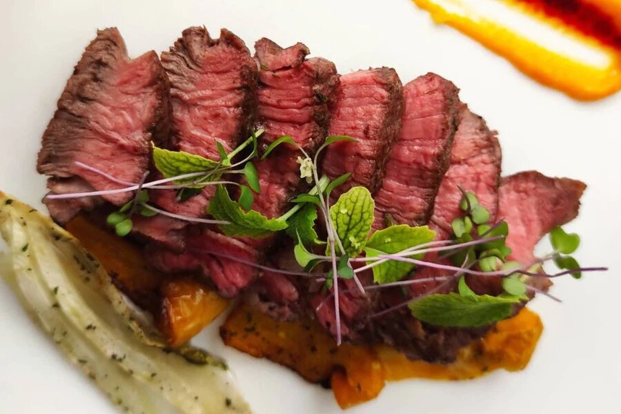 Блюдо, которое мы вам сегодня предлагаем, – это второе блюдо на основе мяса, да еще какого мяса! Очень вкусный шотландский антрекот, восхитительное мясо, которое считается особенно ценным благодаря своим органолептическим характеристикам. В сопровождении очень сладкого крема из желтого перца и запеченных овощей, не забывая при этом о безошибочном аромате трюфеля Чтобы завершить всю микрозелень красной кольраби вместе с ее настоящими листьями, строго органическими. ИНГРЕДИЕНТЫ НА 2 ПЕРСОНЫ: ПОДГОТОВКА: Перцы вымойте и удалите внутренние семена, фенхель также очистите, затем нарежьте оба соломкой. Сбрызните противень маслом, приправьте желтый перец и фенхель солью, свежим тимьяном, панировочными сухарями и сбрызните оливковым маслом, затем запекайте при 180° в течение 30 минут. Теперь займемся мясом, нам нужно как следует разогреть тарелку или сковороду с антипригарным покрытием. Тем временем посолите и поперчите два антрекота и обжарьте их с обеих сторон на горячей сковороде, пок