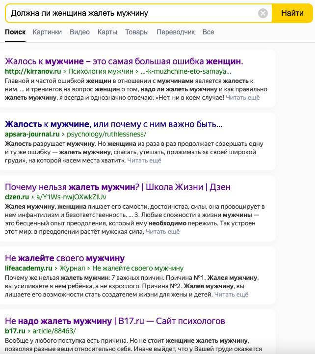 Мне на днях подруга в очередной раз заявила, что «нельзя жалеть мужика». Вот прям никак, никогда и не при каких обстоятельствах. Якобы это обесценивает отношения (ваши с ним) и делает «мужика» «немужиком». Настоящий «мужик» должен решать свои проблемы сам и «не ныть». И что-то я решила залезть с этим в Яндекс. И, действительно, вся первая страница выдачи поисковика кричит о том, что жалеть действительно не следует.