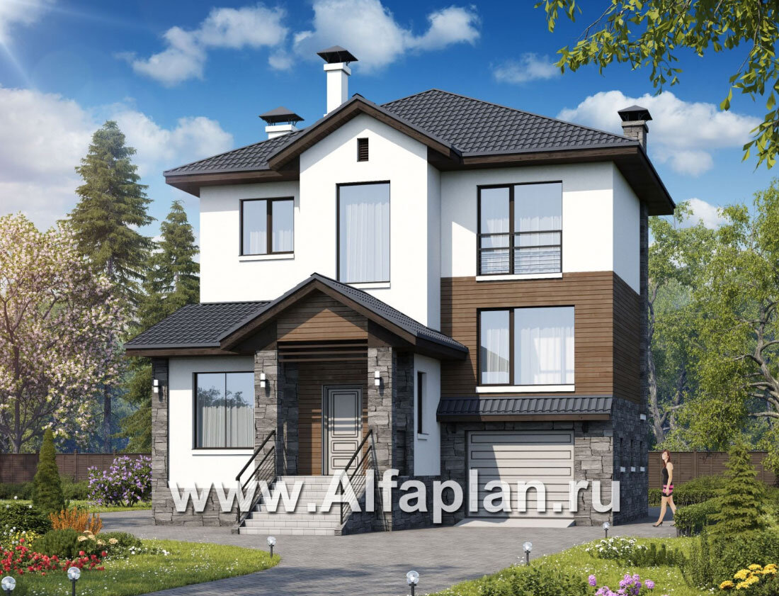 🏡 Дом по проекту «Берег» - современный функциональный коттедж с цокольным этажом и гаражом для автомобиля. Строительство коттеджа возможно из кирпича или газобетона. Подробности о проекте «Берег» ✅ Фасады дома выглядят стильно и современно благодаря сочетанию декоративных каменных плит, деревянного планкена и белой штукатурки. Белые наружные фонари геометрической формы создают мягкое освещение в вечернее время. 💡 Планировка этого коттеджа удобна и функциональна. В цокольном этаже находится сауна, санузел, комната отдыха, из которой можно выйти на лоджию. Вход в гараж осуществляется из холла цоколя. 💡 Центральное помещение первого этажа — гостиная-столовая с панорамным освещением, к которой примыкает кухня. В объем гостиной вписана лестница на второй этаж. Также на этаже запланирована просторная прихожая, санузел и постирочная. 💡 Второй этаж, по традиции — приватная зона. Здесь находятся три спальни, холл и общая ванная. Возможно, вам также будет интересен вариант этого проекта — 3