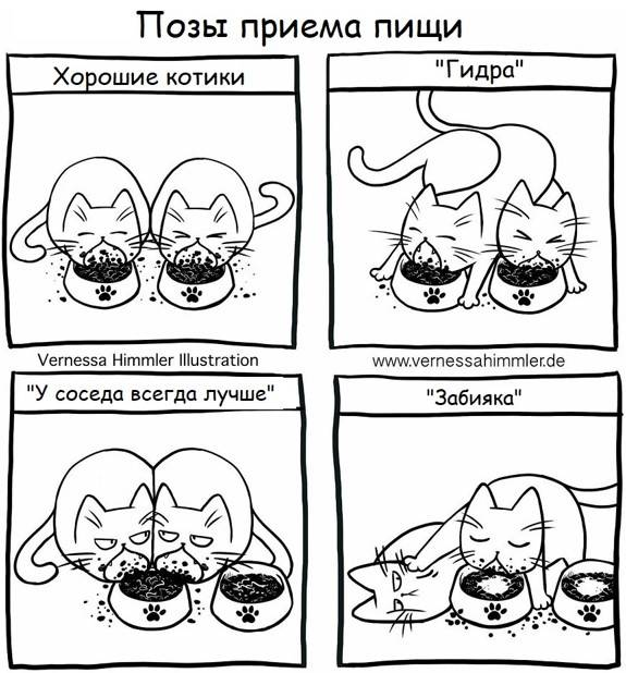Комиксы немецкой художницы Вернессы Гиммлер несколько напоминают пословицу «Не было у бабы горя, купила баба порося». Только у Вернессы роль порося исполняют два шкодливых, высокомерных, до предела избалованных кота. Пушистых тиранов Вернессы зовут Микош и Кошка. Молодая художница взяла этих двух бродяжек из приюта. Они быстро освоились в ее доме, осмелели и превратили ее из хозяйки в служанку. Вернесса покорно сносит все их выходки и ведет иллюстрированный дневник, показывающий, что творят Микош и Кошка. Правда, художница не забывает напоминать, что все это не более чем шутки, и что на самом деле она обожает своих питомцев и ей нравится быть «сумасшедшей кошатницей». Вернесса — профессиональный иллюстратор с соответствующим образованием. Свою магистерскую степень в области иллюстрации она получала в Высшей школе прикладных наук Гамбурга, где училась на факультете дизайна. Сегодня она работает иллюстратором-фрилансером. Стиль ее коммерческих иллюстраций разительно отличается от стиля,